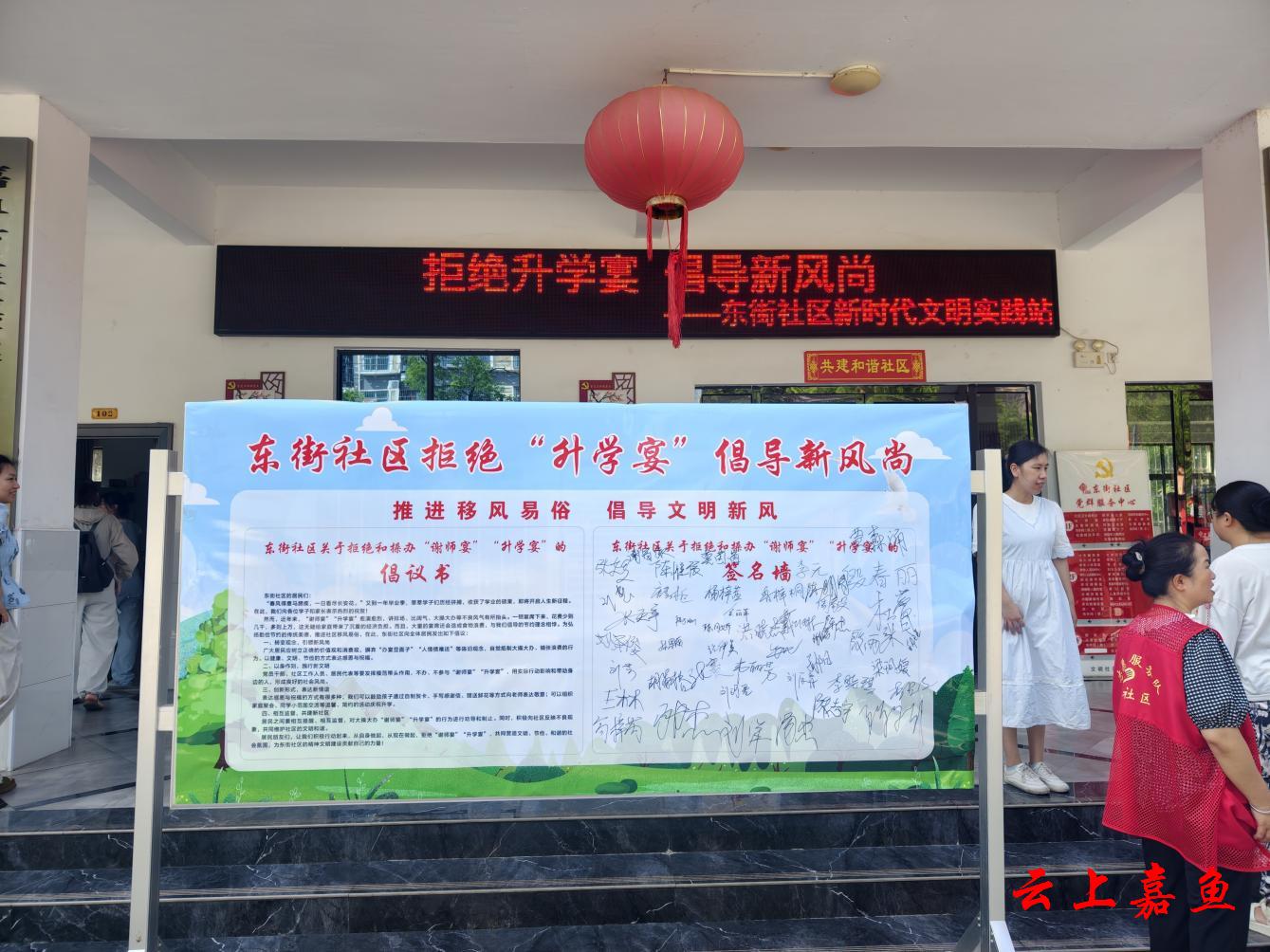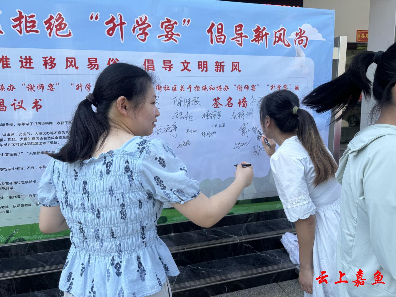 云上嘉鱼报道(全媒体记者邓丹 通讯员刘喜)“我承诺,不办升学宴,不凑这份热闹!”7月15日清晨,鱼岳镇东街社区党群活动中心广场便热闹起来,毕业生和家长们排着队在锃亮的签名展板上郑重签下自己的名字。一场由东街社区团委、社区新时代文明实践站共同举办的“拒绝升学宴,倡导新风尚”主题活动,正以鲜活清新的姿态拉开序幕。