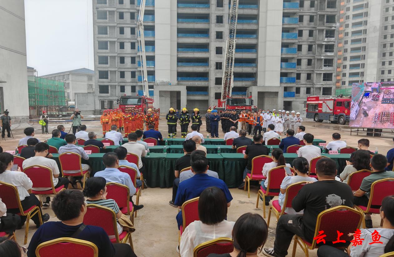 9月28日,嘉鱼县在诗经花园小区在建工地开展高层火灾扑救综合实战演练,县委副书记、县长胡金云出席活动并宣布演练开始。