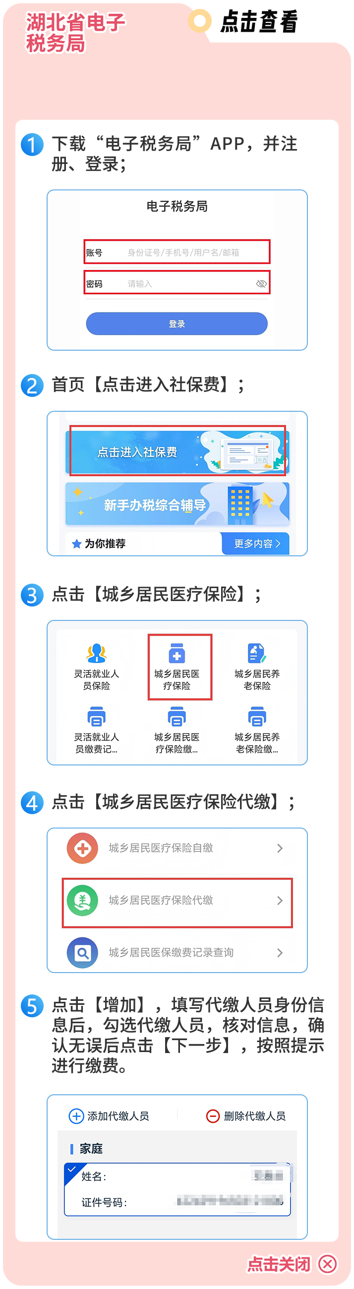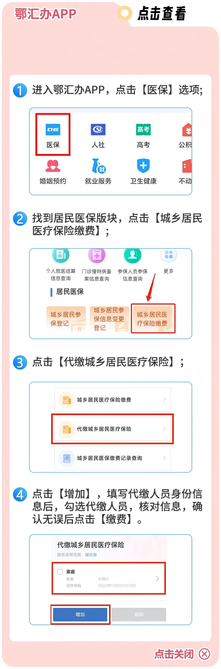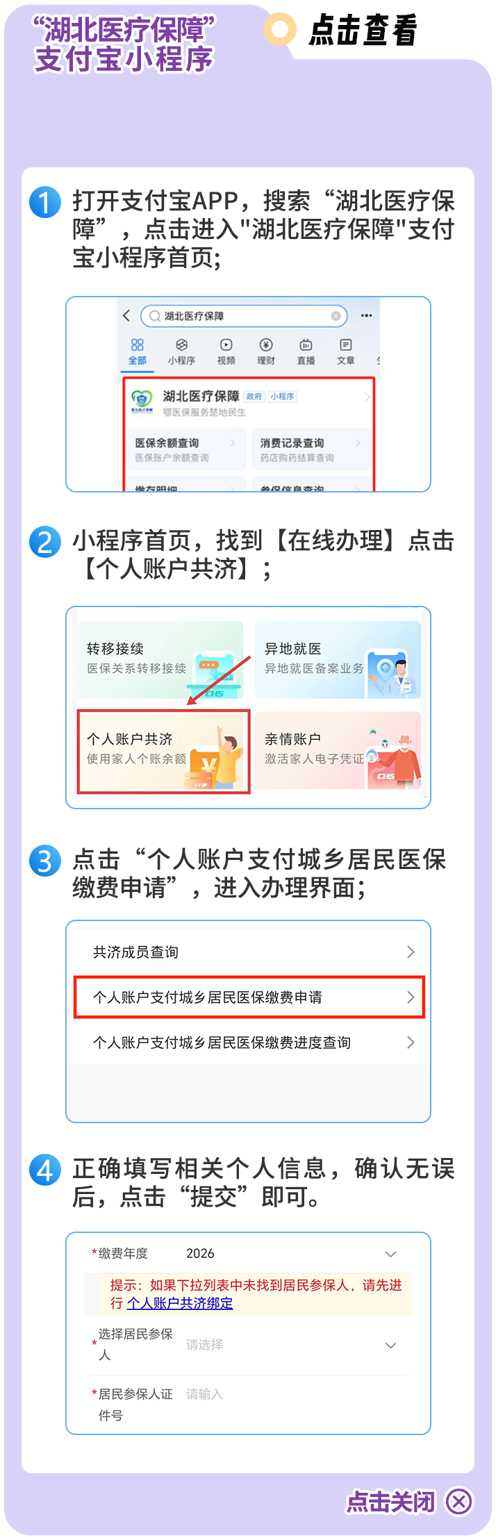 集中参保缴费期为 2025年10月-2026年2月 衷心希望您或您的家人 及时参保缴费 为自己和家人 提供一份健康保障 一张海报 带您划重点 ↓↓↓ 01 02 03 戳下方【点击查看】 了解完整步骤 04 戳下方【点击查看】 了解完整步骤 连续参保有激励, 断保再续要等待。 一定要记得 为自己或家人缴费哦! 如果您有医保方面的其他疑问 可在公众号对话框留言。 或者回复下方关键词/数字, 快速获取医疗保障相关政策资讯。 也可以拨打以下电话进行咨询 ↓↓↓ 来源:湖北医疗保障
