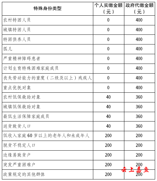 政府针对特殊人群参加城乡居民医保,进行分类资助,具体资助标准如下图所示: