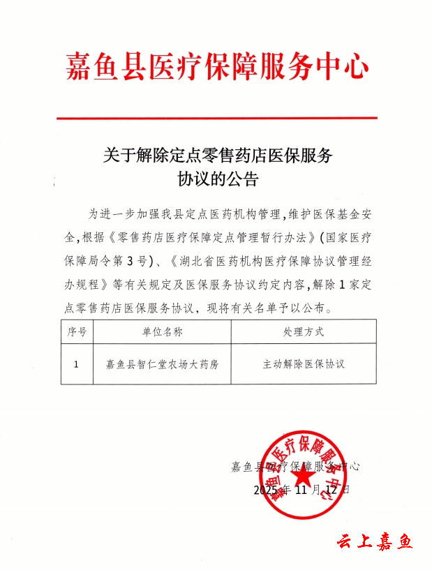 关于解除定点零售药店医保服务协议的公告