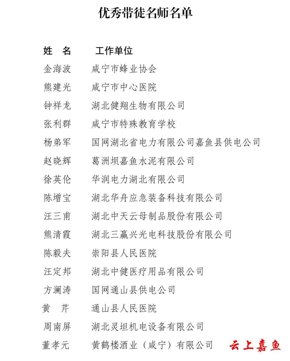 国网湖北省电力有限公司嘉鱼县供电公司杨弟军、葛洲坝嘉鱼水泥有限公司赵晓辉2人获评为优秀带徒名师。