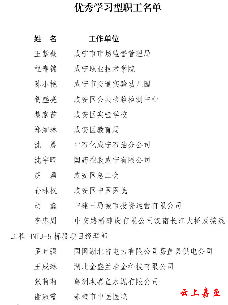 中建三局城市投资运营有限公司胡鑫、中交路桥建设有限公司汉南长江大桥及接线工程HNTJ-5标段项目经理部李忠周、国网湖北省电力有限公司嘉鱼县供电公司罗时强、湖北金盛兰冶金科技有限公司王成琳、葛洲坝嘉鱼水泥有限公司张莉莉5人获评为优秀学习型职工。
