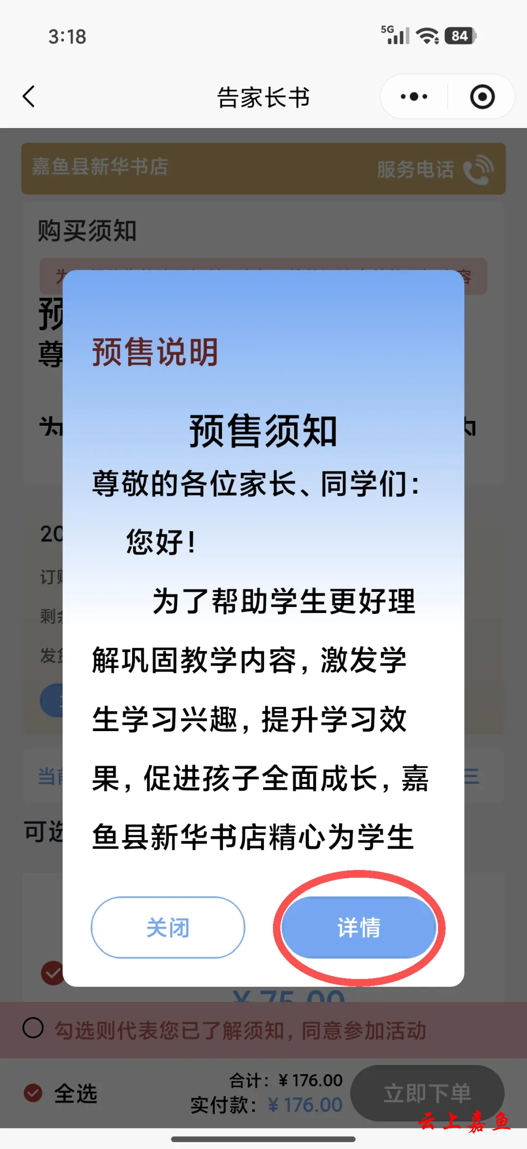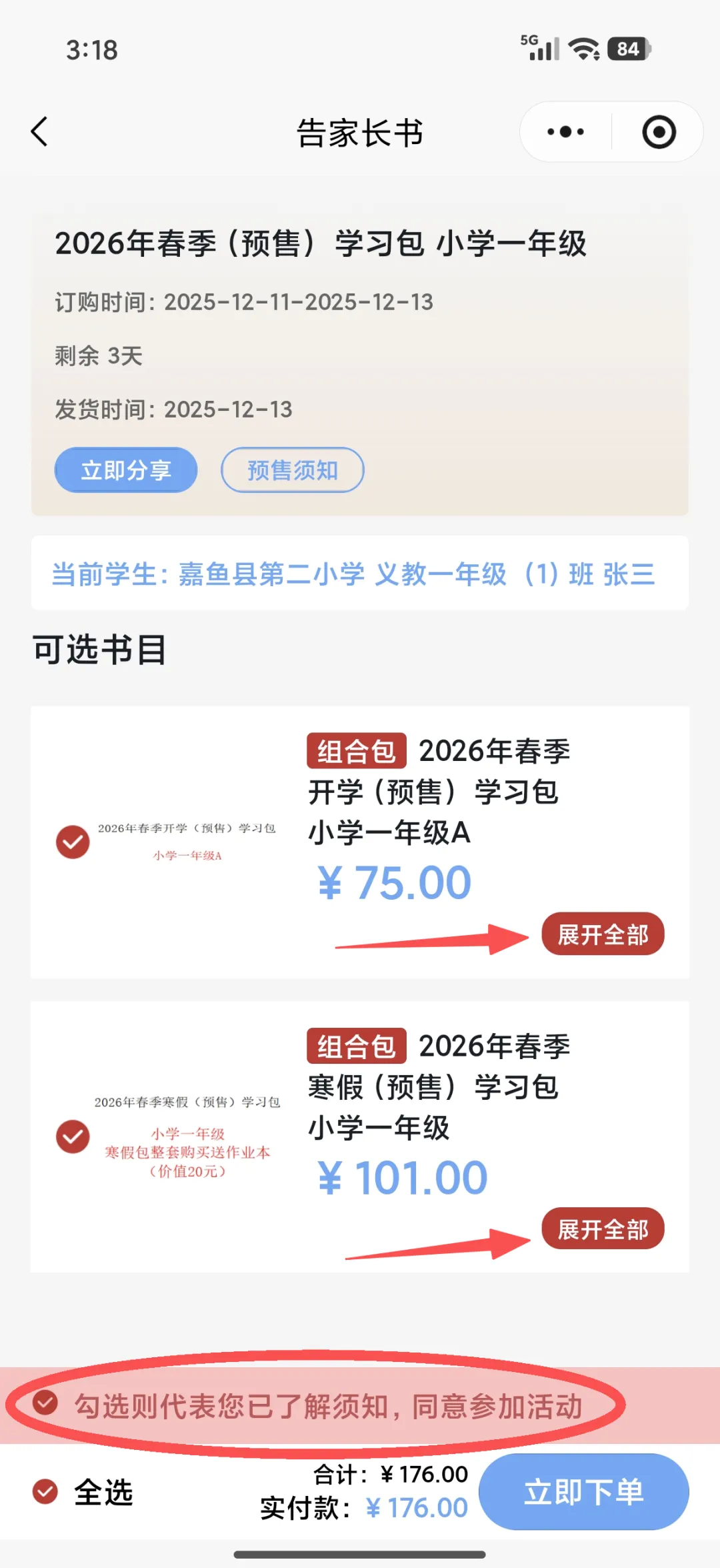3.提交成功后点击“查看详情”,仔细查看“预售须知详情”后返回,然后点击“勾选同意参加活动”,点击“立即下单”后进行学生信息二次确认无误后点击“立即支付”完成支付操作。