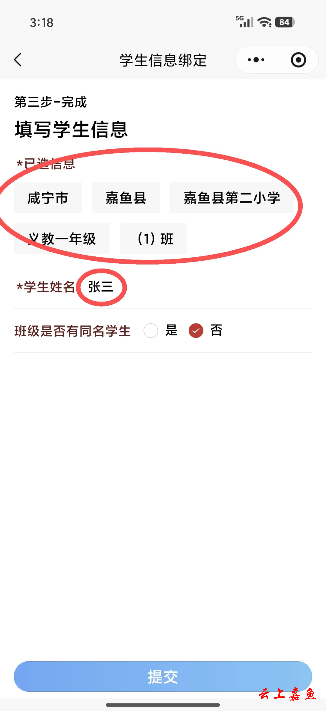 2.确认在读学校信息是否准确,选择在读年级、班级,填写学生姓名。(身份证号默认不填,如有同班同名学生才须填写)。如果信息错误,点击“预售”-“学生信息”-“解绑”,重新录入即可。