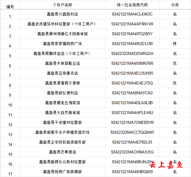根据《嘉鱼县个体工商户分型分类精准帮扶工作办法》规定,嘉鱼县市场监管局组织开展了嘉鱼县2025年度“名特优新”个体工商户认定工作。经宣传发动、自愿申请、部门推荐、材料审查、走访核实等程序,认定17家个体工商户为嘉鱼县2025年度“名特优新”个体工商户,现予以公示。特此通告。 嘉鱼县市场监督管理局 2025年12月18日