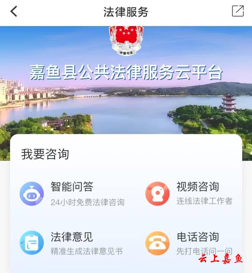 最后,我还要给我们云上嘉鱼打一个小广告。进入云上嘉鱼APP之后,首页会有一个法律服务的栏目,我们点击进去之后,就进入了嘉鱼县公共法律服务云平台,这里可以24小时为大家免费提供各类法律服务,比如说咨询类的,我们经常会遇到乡亲邻里如何应对邻里关系,就会给大家带来一条方便的回答。