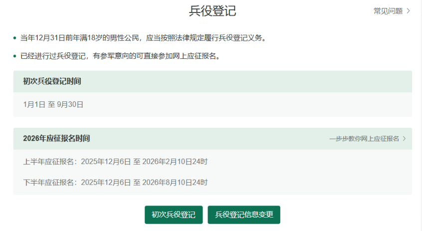 2026年12月31日前年满18周岁,户籍在嘉鱼的男性公民,必须依法履行兵役登记义务。大学文化程度24周岁前,高中文化程度22周岁前,初中文化程度20周岁前的适龄男性公民未登记的要进行补登,需登录系统核验更新个人信息(家庭、住址、学业、联系方式有变化的务必修改)。