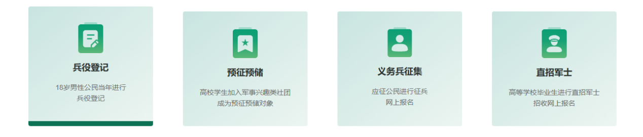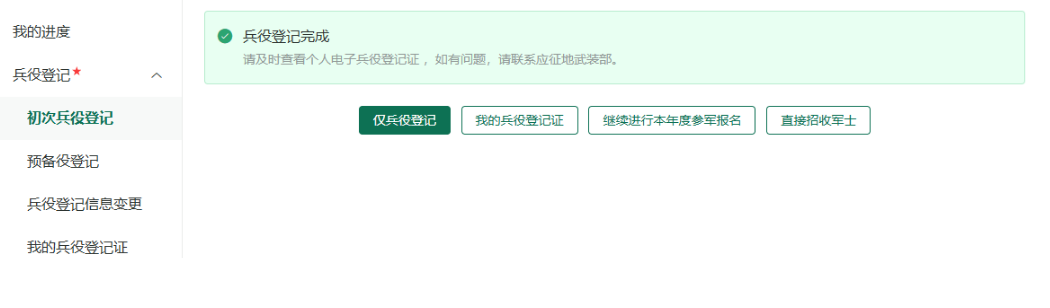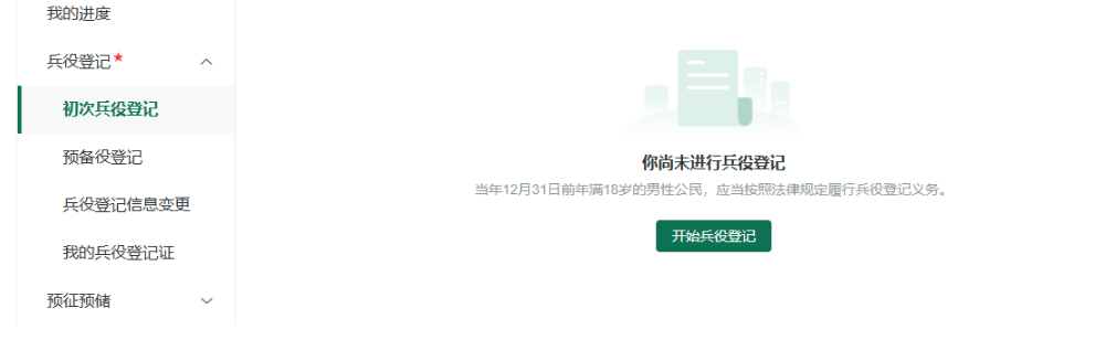 第二步:初次兵役登记的,点击“初次兵役登记”;变更兵役登记信息,点击“兵役登记信息变更”。