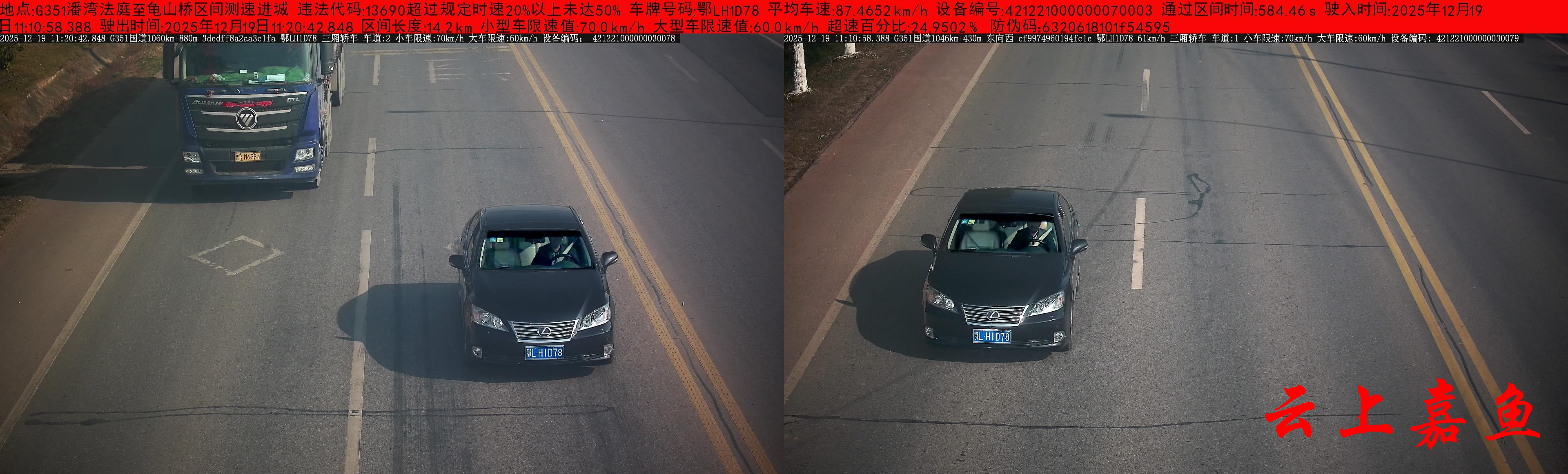 违法地点:G351潘湾法庭至龟山桥区间测速路段 违法车辆:鄂LH1D78