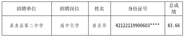 根据《2025年湖北省咸宁市嘉鱼县高中阶段教师招聘公告》要求,我县2025年高中阶段教师招聘经资格审查、面试、体检和考察,现将第二批拟聘用的1人予以公示,公示期为7天,从2025年12月30日起至2026年1月5日。