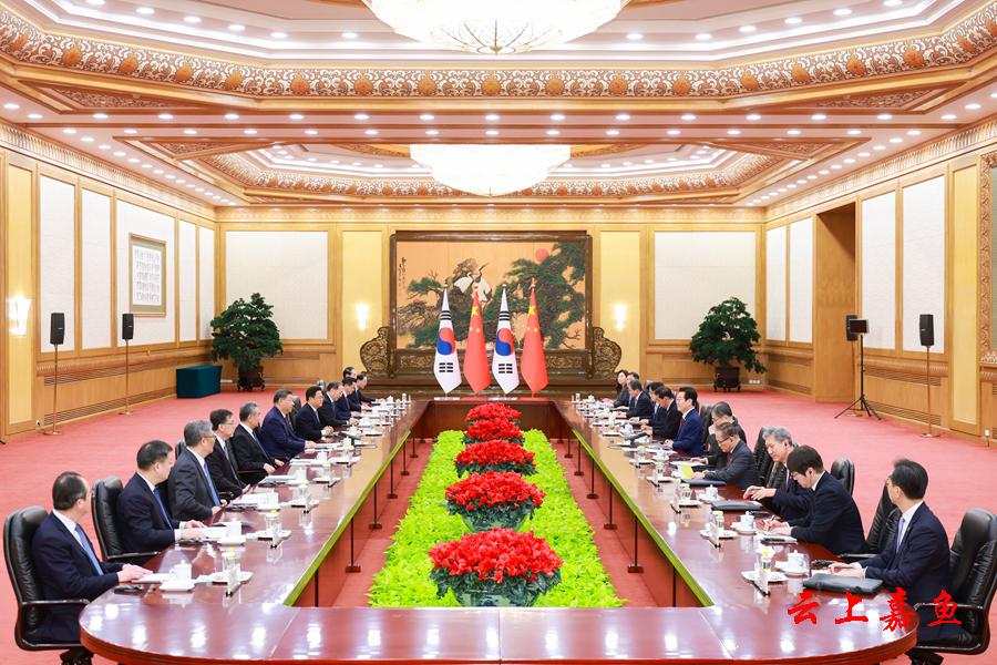 1月5日下午,国家主席习近平在北京人民大会堂同来华进行国事访问的韩国总统李在明举行会谈。新华社记者 刘彬 摄