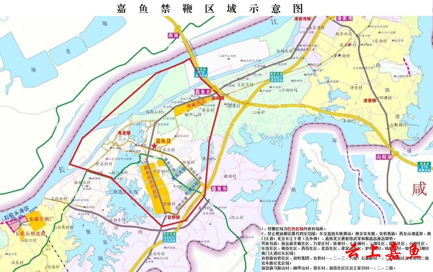 二、禁止燃放烟花爆竹四至范围:东至嘉鱼东收费站;南至官朱路、官桥集镇;西至山湖温泉、南门大道;北至长江干堤(含外洲)、嘉鱼北交通枢纽武深和蕲嘉高速高架桥。具体包括: