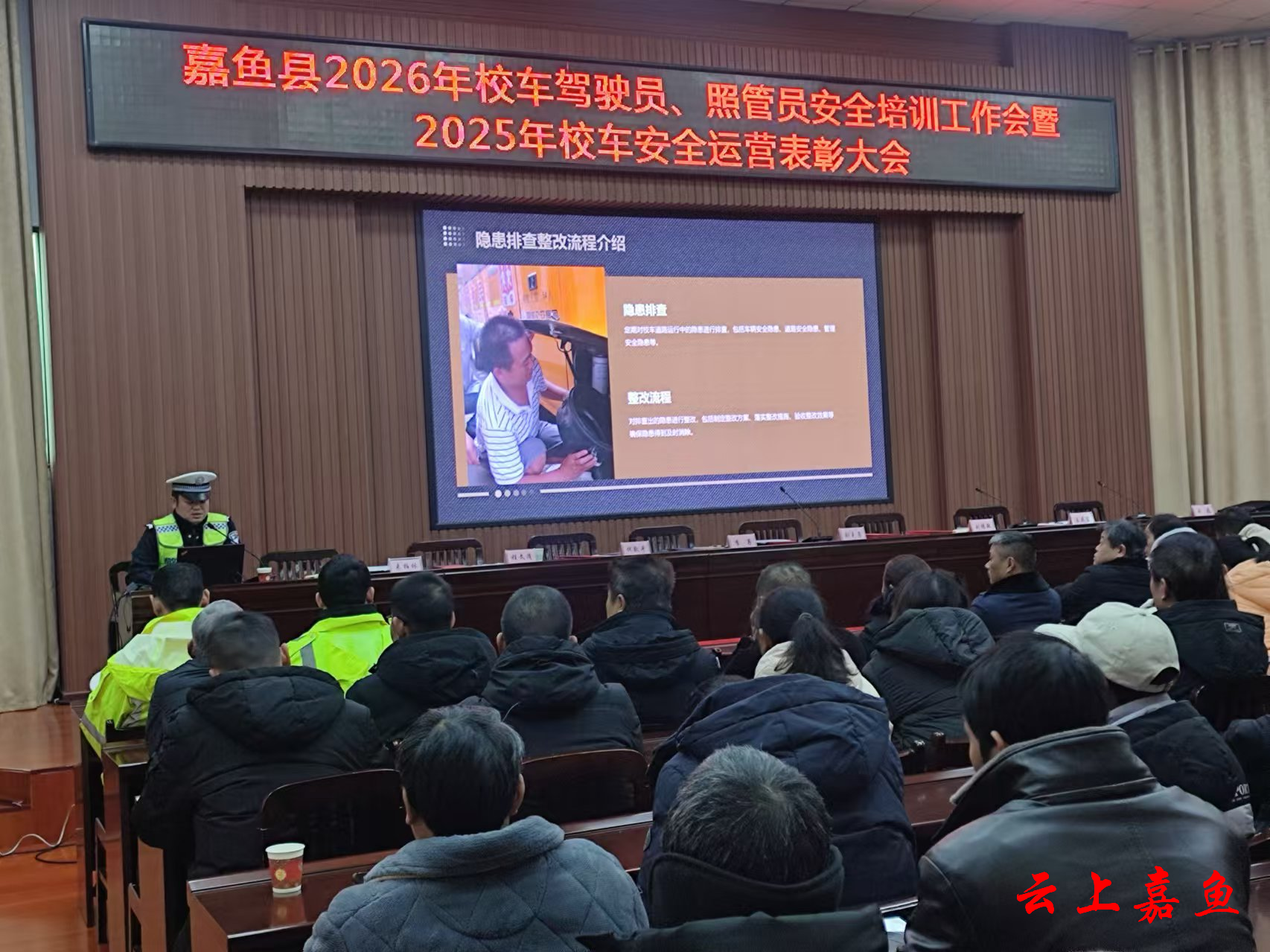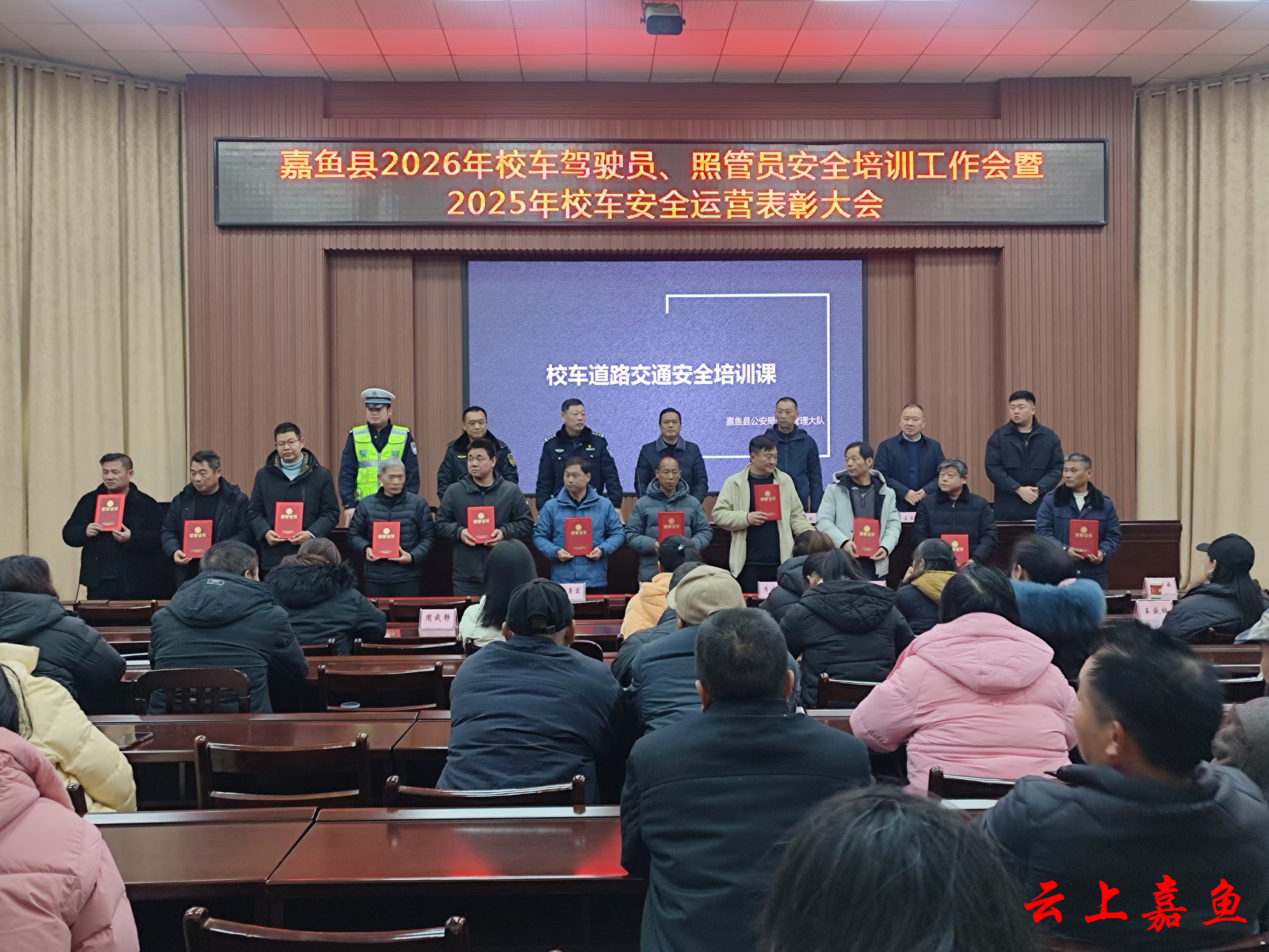 云上嘉鱼报道(通讯员孙杨模)1月31日上午,嘉鱼县召开2026年校车驾驶员、照管员安全培训工作会暨2025年校车安全运营表彰大会,全县120余名校车驾驶员、随车照管员参加培训,县教育局、县公安局交管大队、县交通局执法大队、县交建集团鸿祥校车公司等相关人员参加会议。