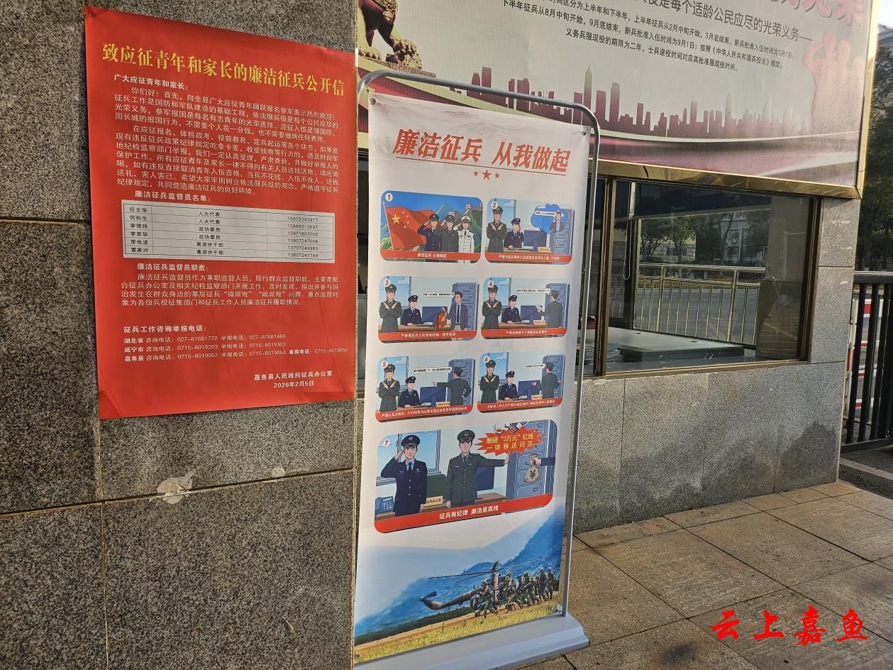 云上嘉鱼报道(通讯员李程)为深入贯彻上级廉洁征兵工作部署,切实筑牢征兵工作纪律防线,近日,我县以上级统一下发的廉洁征兵漫画为核心载体,多点发力、全域覆盖,同步开展街头宣传、阵地展示,推动廉洁征兵理念入脑入心、落地见效。