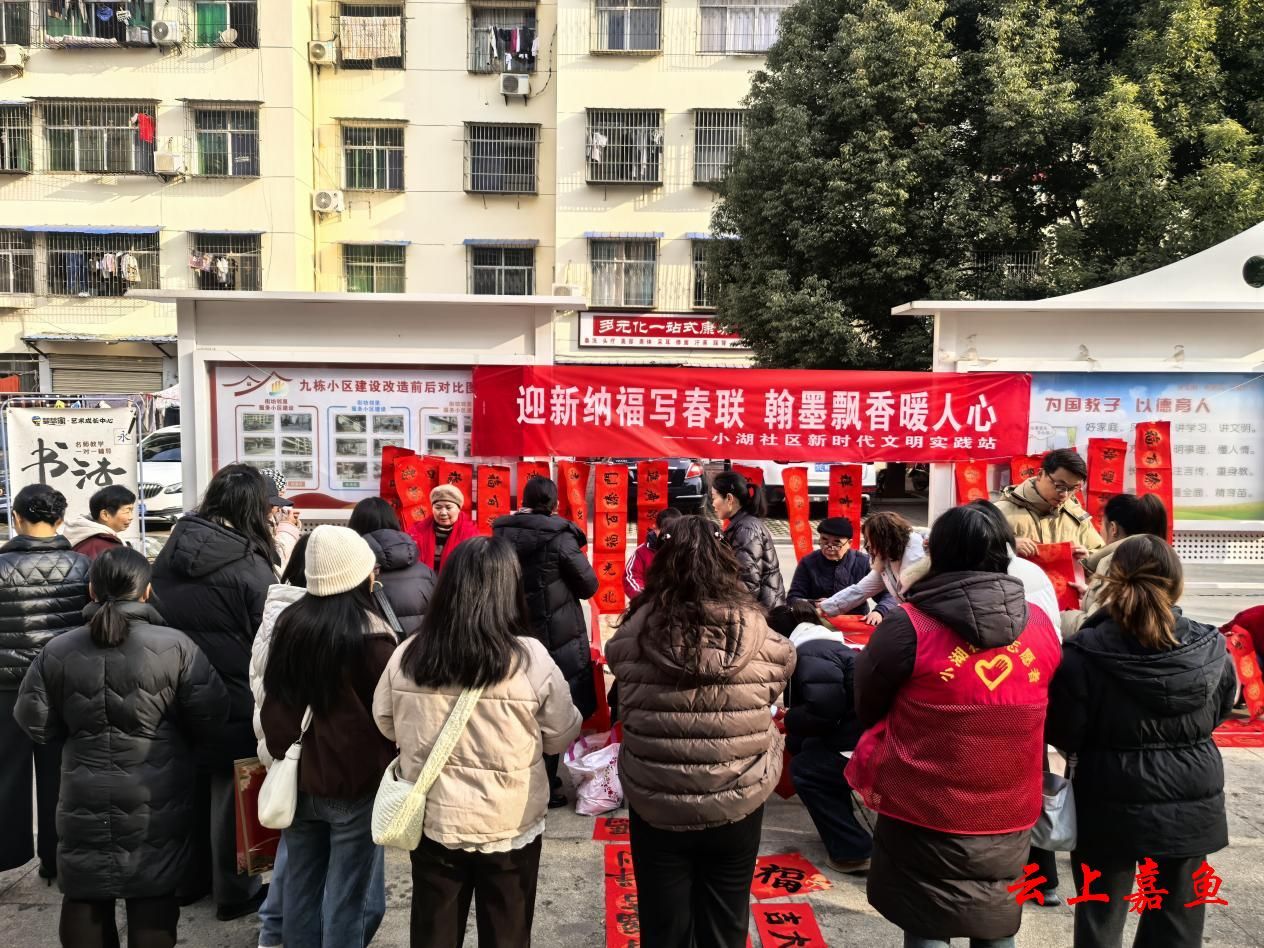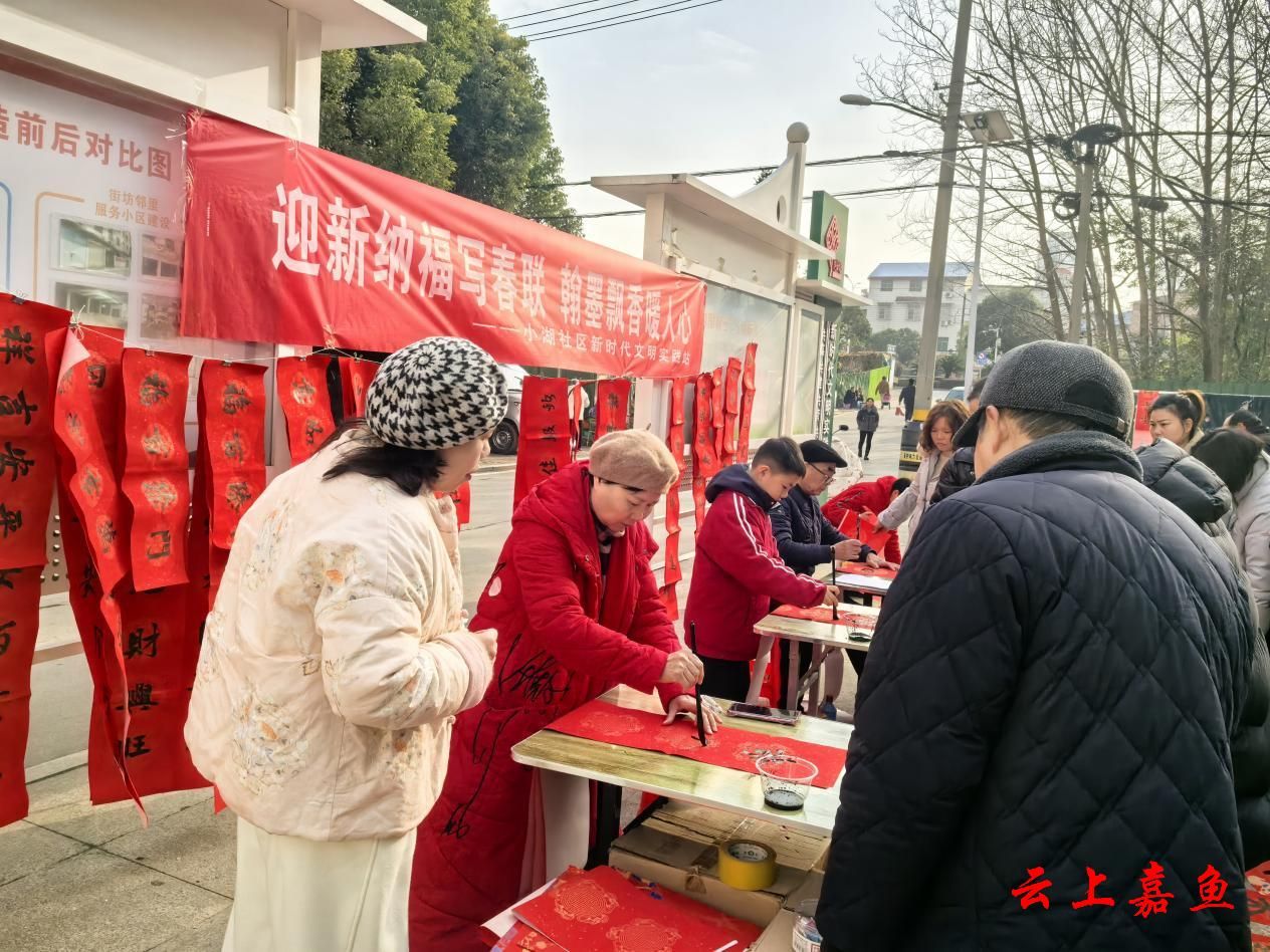 云上嘉鱼报道(通讯员周露黎)新春将至,年味渐浓。为弘扬中华优秀传统文化,营造欢乐祥和的节日氛围,2月12日上午,鱼岳镇小湖社区党总支联合社区新时代文明实践站在九栋广场举办“迎新纳福写春联 翰墨飘香暖人心”迎新春主题活动。活动特邀梦想家艺术成长中心师生现场挥毫泼墨,中国人寿嘉鱼支公司志愿者为辖区居民送“福”到家,传递新春祝福。