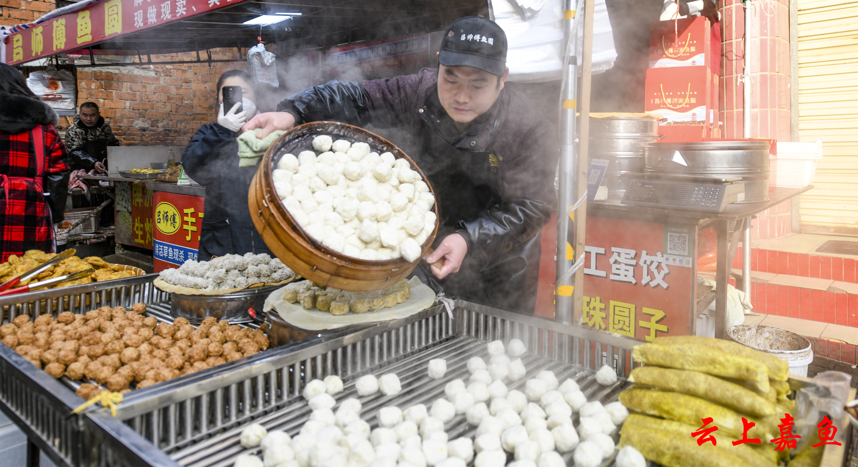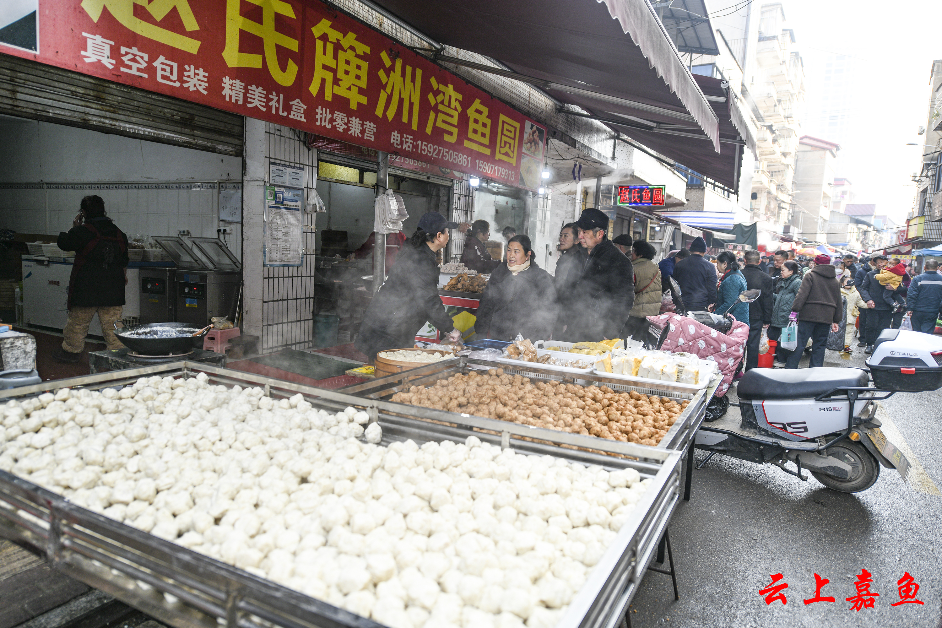 云上嘉鱼报道(全媒体记者雷平)2月12日,嘉鱼城区考棚村鱼圆一条街人流如织,热闹非凡。沿街排列的老字号吴冬生鱼圆、夏名刚簰洲鱼圆等近20家鱼圆店正在赶制鱼圆、鱼糕等年货,刚出锅的生炸鱼圆、簰洲鱼圆、鱼糕等热气腾腾、香飘四溢,浓浓的年味吸引了八方来客。除了现场销售,还同时打包销往全国各地。