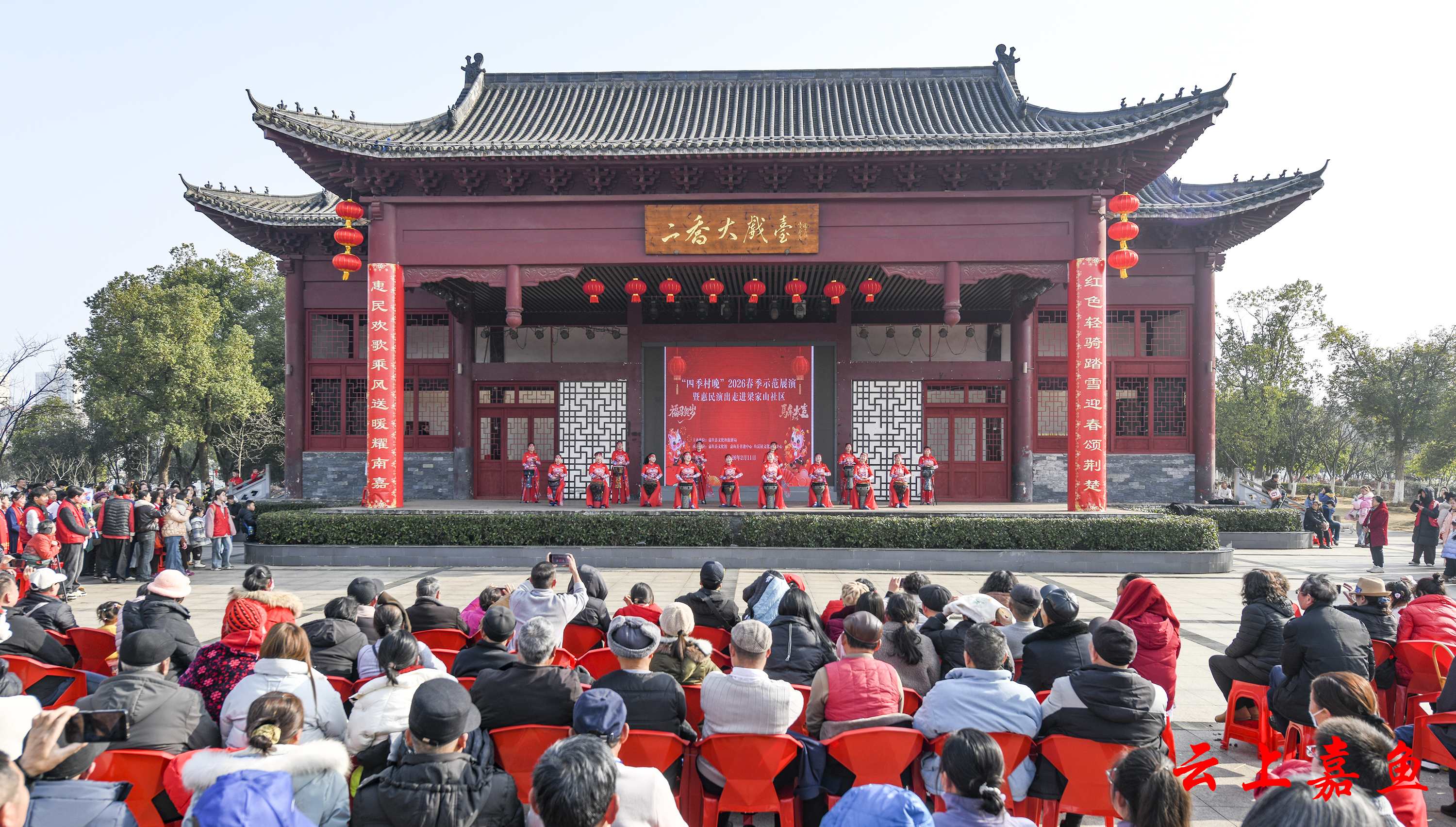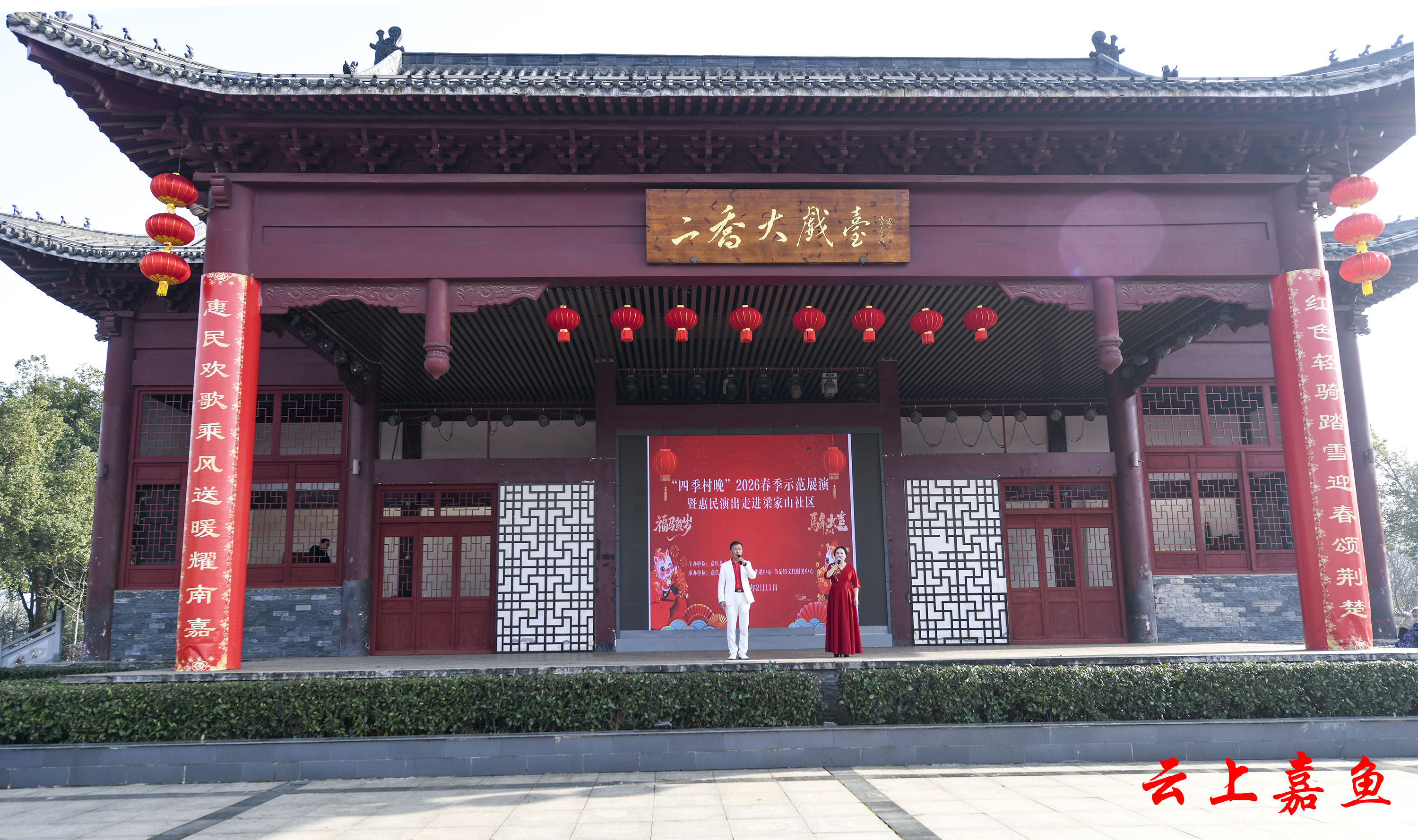 云上嘉鱼报道(全媒体记者雷平 通讯员熊荻)2月11日,嘉鱼县二乔公园大戏台歌声飞扬、掌声不断,“四季村晚”2026春季示范展演暨惠民演出走进鱼岳镇梁家山社区,为现场群众献上一场精彩纷呈、年味浓郁的文化盛宴。本次活动由嘉鱼县文化和旅游局、鱼岳镇人民政府主办,县文化馆、县非遗中心、鱼岳镇文化服务中心承办,15个精品节目轮番上演,以群众喜闻乐见的形式传递新春祝福,丰富群众精神文化生活。