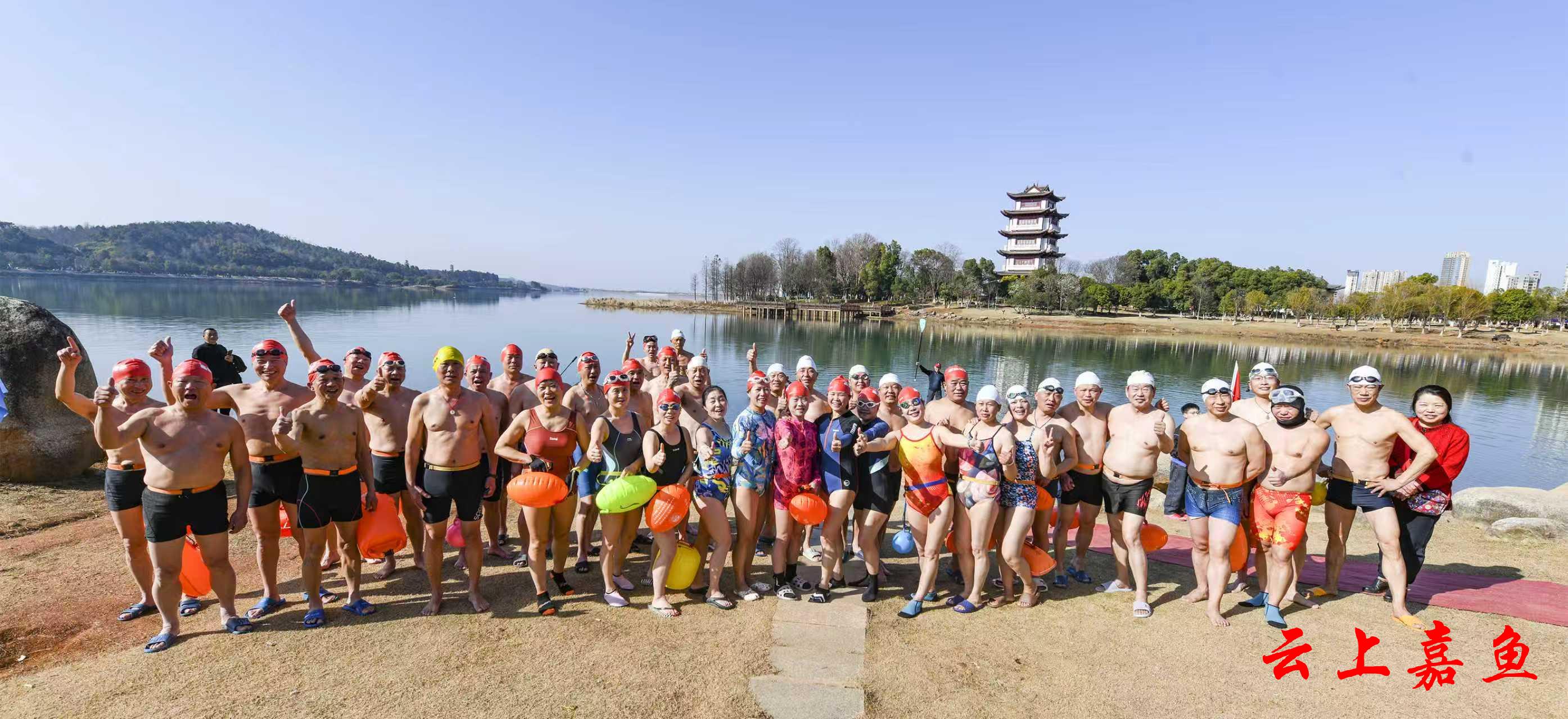 (全媒体记者雷平)2月21日,嘉鱼冬泳协会、嘉鱼游泳协会100多名冬泳爱好者,畅游三湖连江。蓝天白云,青山绿水,欢声笑语迎马年。