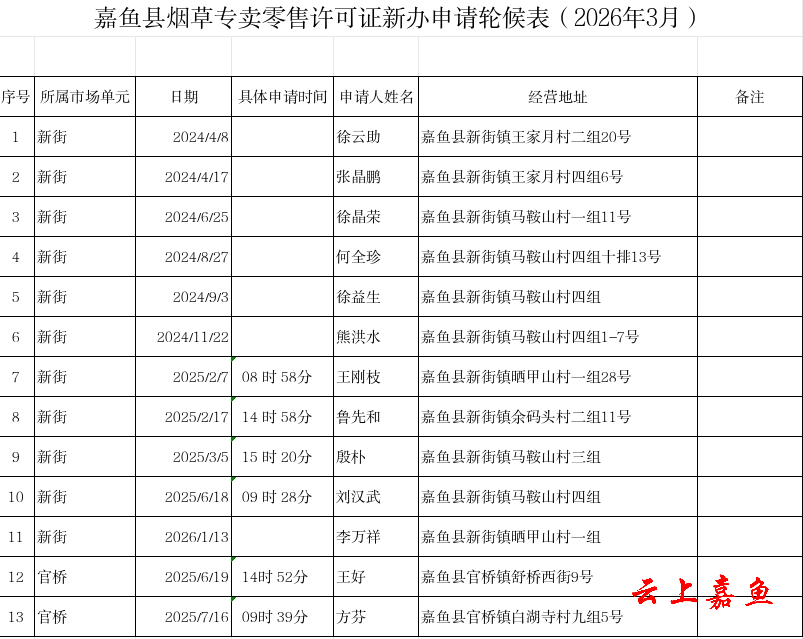 嘉鱼县烟草专卖零售许可证新办申请轮候表(2026年3月)