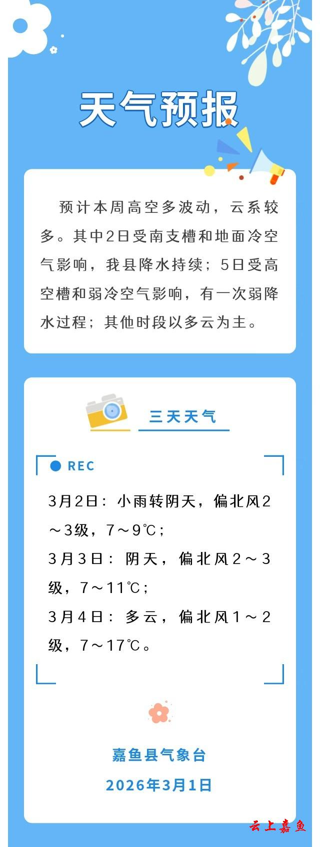 2026年3月1日嘉鱼天气预报