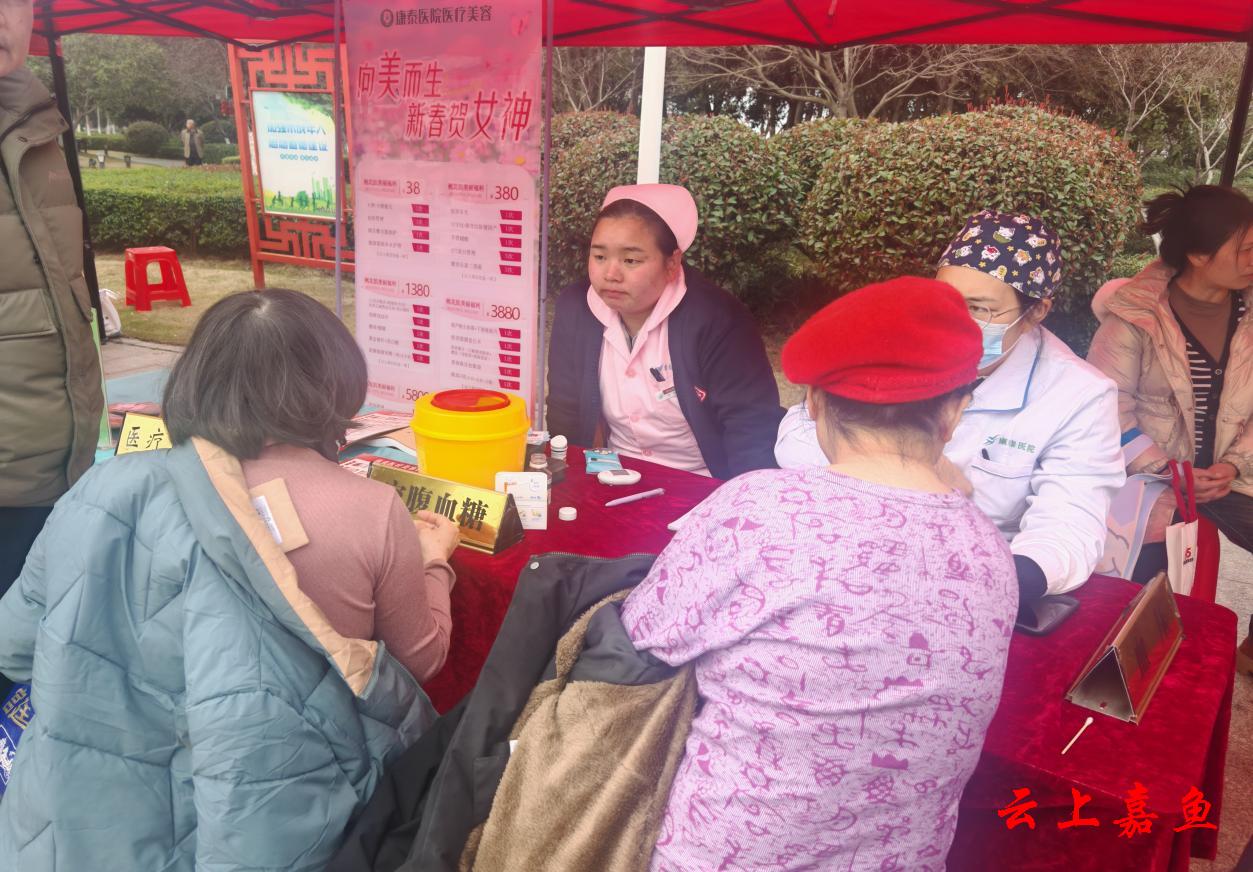 县康泰医院的医护志愿者们身着白大褂,摆起便民诊疗台,为现场群众免费测量血压、提供专业问诊服务,耐心解答常见病防治疑问,给出个性化健康建议,把便捷医疗服务送到群众身边。