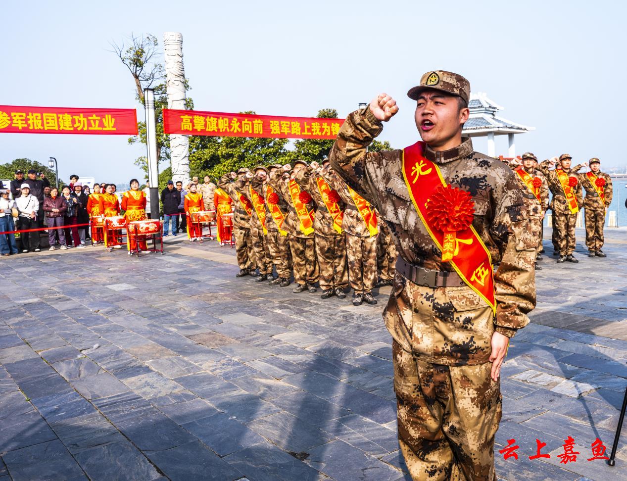 “听吧新征程号角吹响,强军目标召唤在前方……”随后,全体新兵齐声高唱《强军战歌》,歌声铿锵有力、响彻湖畔,展现出新时代青年投身强军事业的昂扬风貌。新兵代表上台发言,誓言将牢记初心、不负韶华,到部队后苦练本领、忠诚履职,用青春热血守护家国安宁。出征宣誓环节,全体新兵高举右拳、庄严宣誓,铮铮誓言回荡现场,彰显保家卫国的坚定决心。