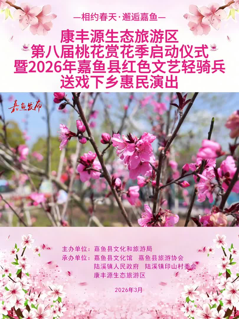 云上嘉鱼报道(全媒体记者祁声坤)相约春天,邂逅嘉鱼。3月21日上午,嘉鱼县陆溪镇康丰源生态旅游区游客广场人潮涌动、春意盎然,康丰源第八届桃花赏花季启动仪式暨2026年嘉鱼县红色文艺轻骑兵送戏下乡惠民演出在此举行。