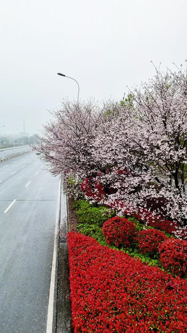 从路面抬眼望去,诗经大道成了樱花的长廊。满树繁花如云似雪,压得枝桠微微低垂,与路边艳红的石楠、鲜绿的灌木交织成锦。湿润的路面映着天光,车辆缓缓驶过,仿佛穿行在一幅流动的春景图里,把嘉鱼的春日浪漫,铺向了远方。