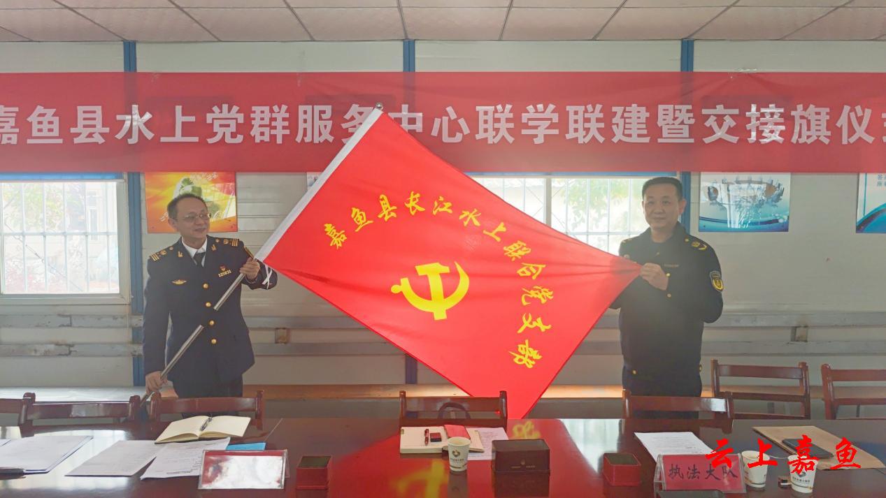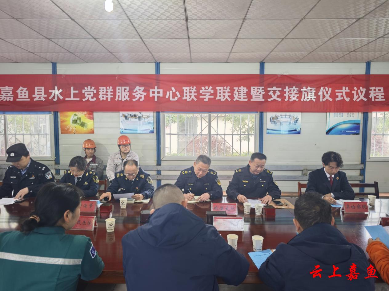 云上嘉鱼报道(全媒体记者陈铮)3月26日,嘉鱼县水上党群服务中心联学联建暨交接旗仪式在湖北港口集团咸宁有限公司举行,县交通运输局、县检察院、长航公安局武汉分局嘉鱼派出所、武汉咸宁海事处、武汉大学中南医院嘉鱼医院、湖北港口集团咸宁有限公司、嘉通物流码头工作人员代表参加活动。