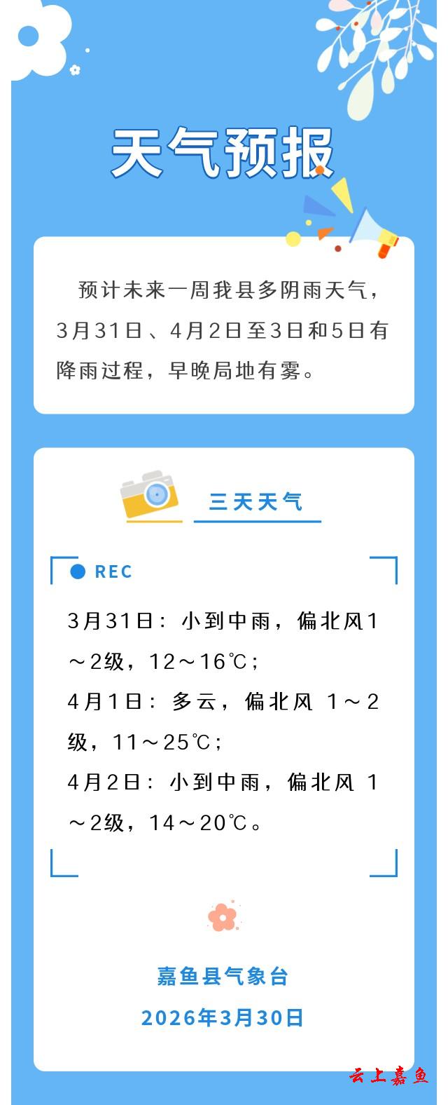 2026年3月30日嘉鱼天气预报