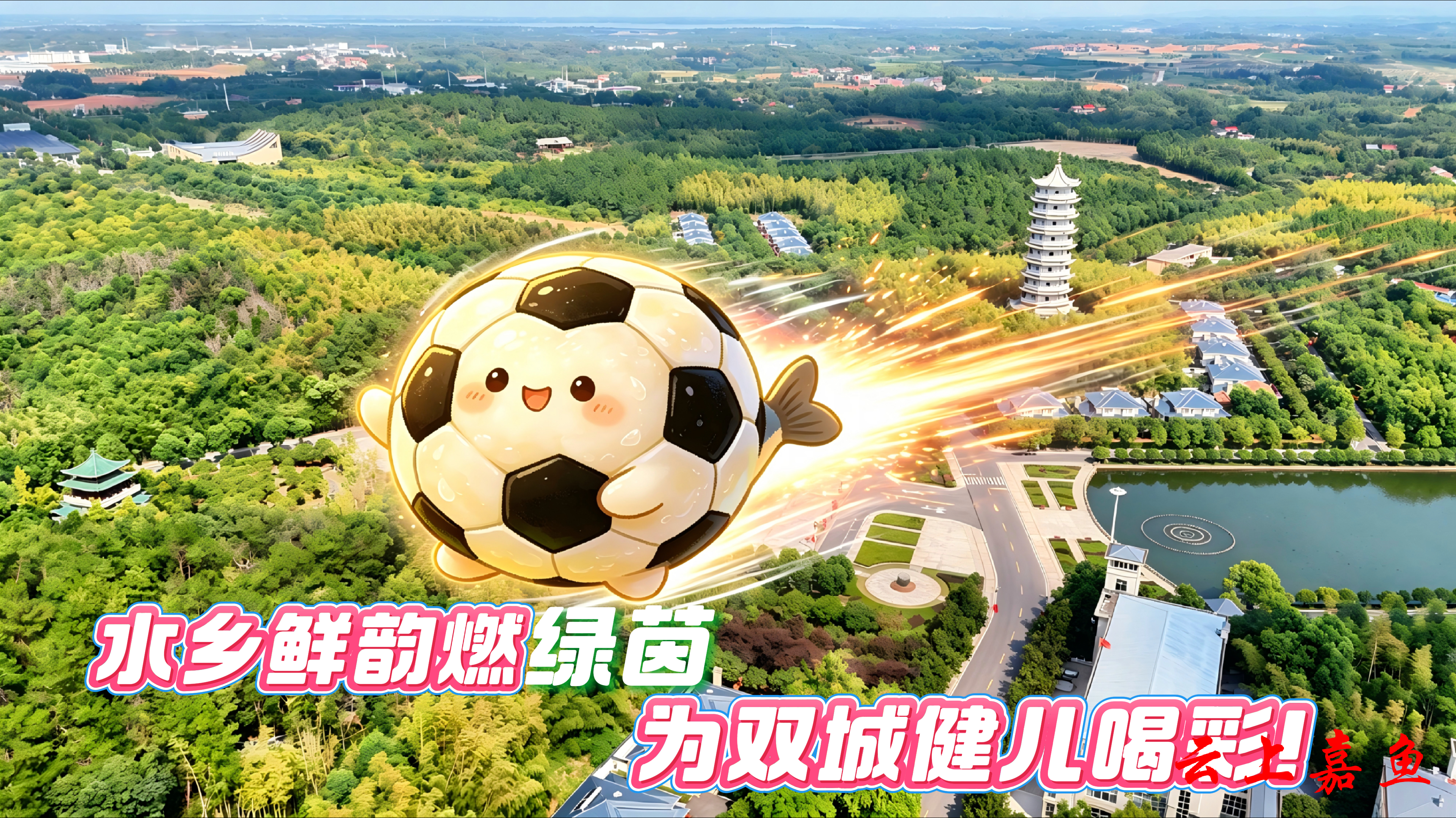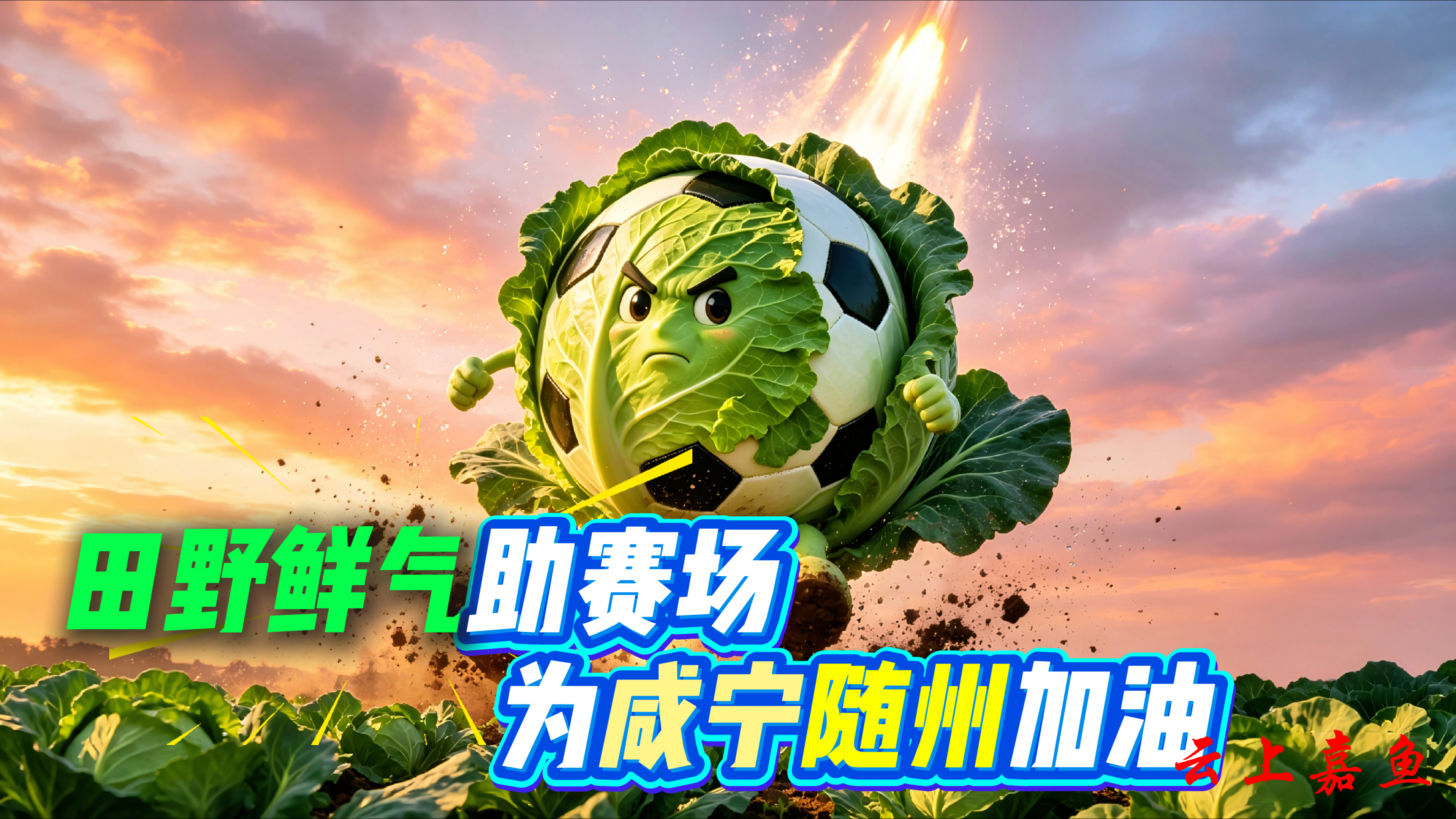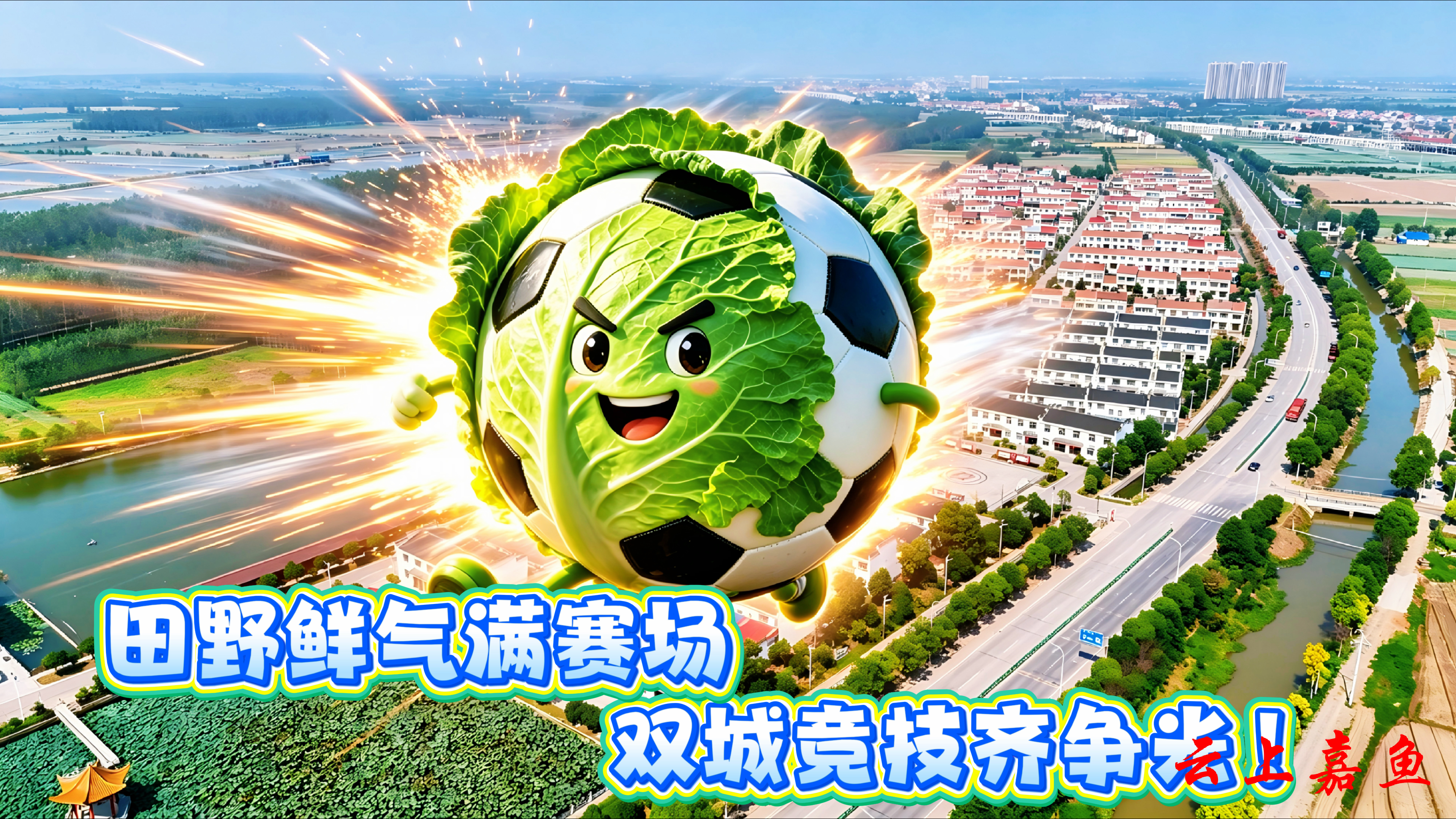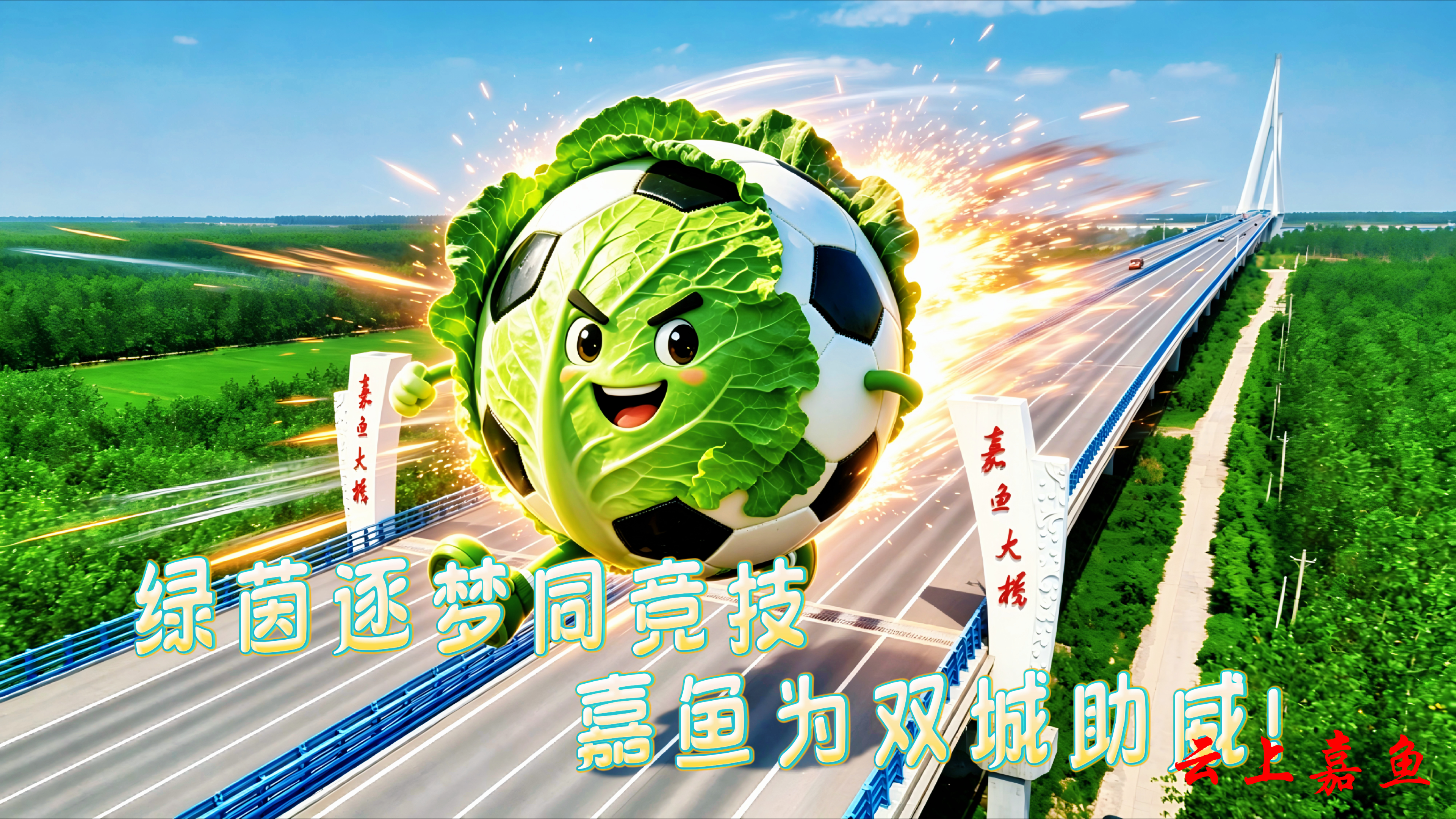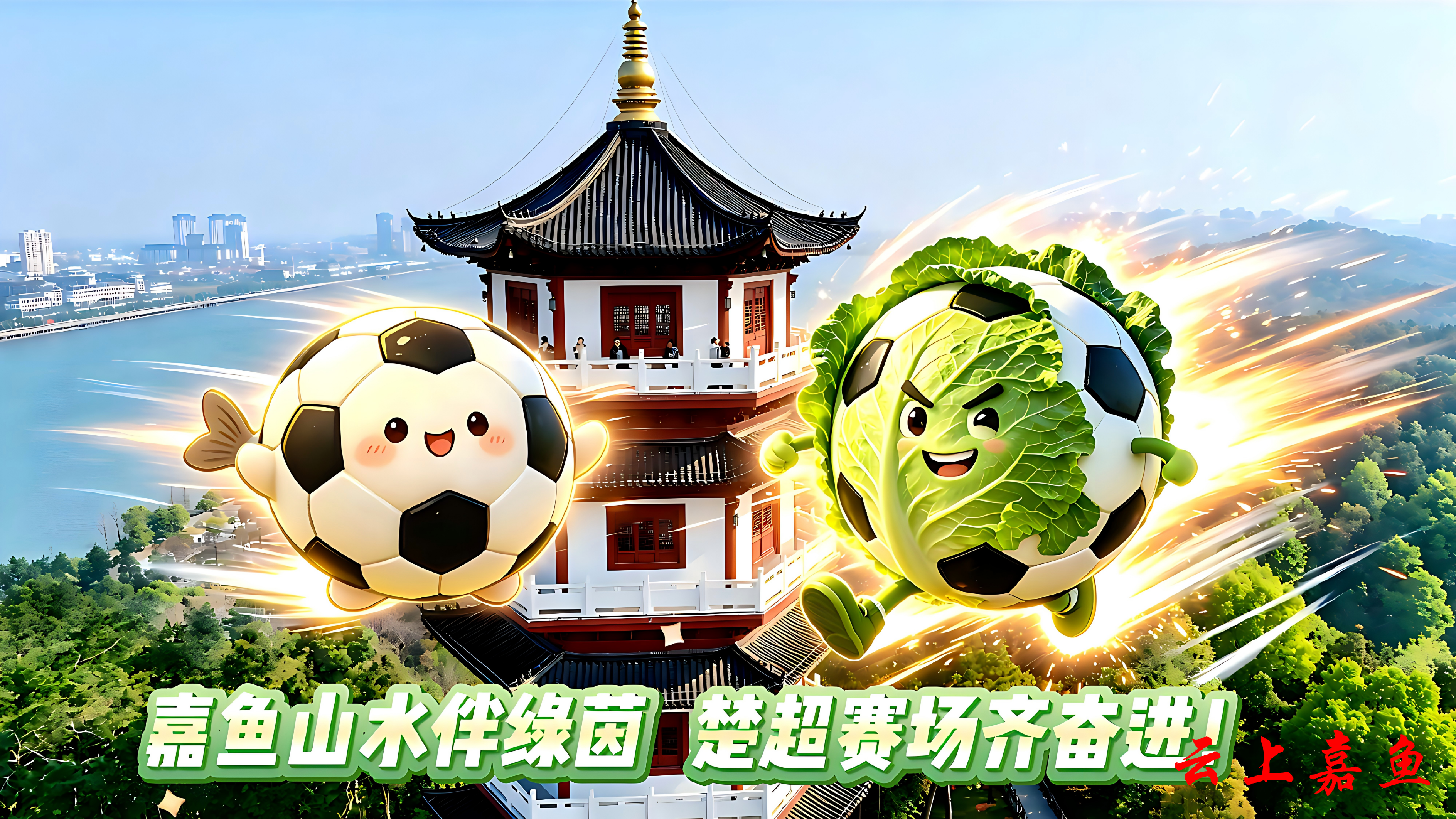 以AI创意打造的嘉鱼甘蓝、嘉鱼鱼圆等嘉鱼特色元素,飞越三湖连江、二乔故里、岳公楼等嘉鱼标志性景点,将嘉鱼田园活力与水乡灵气带到赛场,为咸宁、随州两支球队加油喝彩,让文旅魅力与体育精神同频共振。