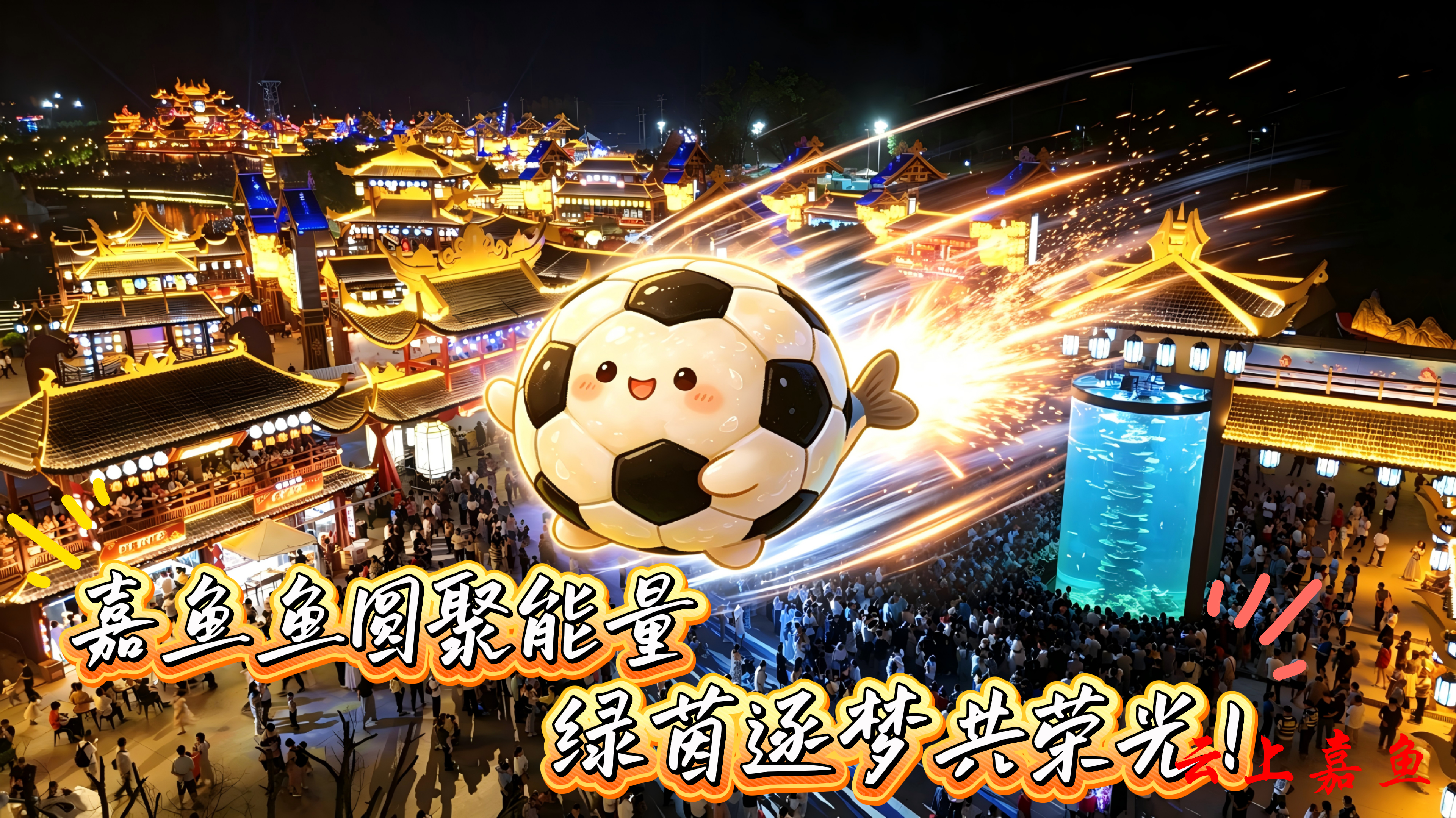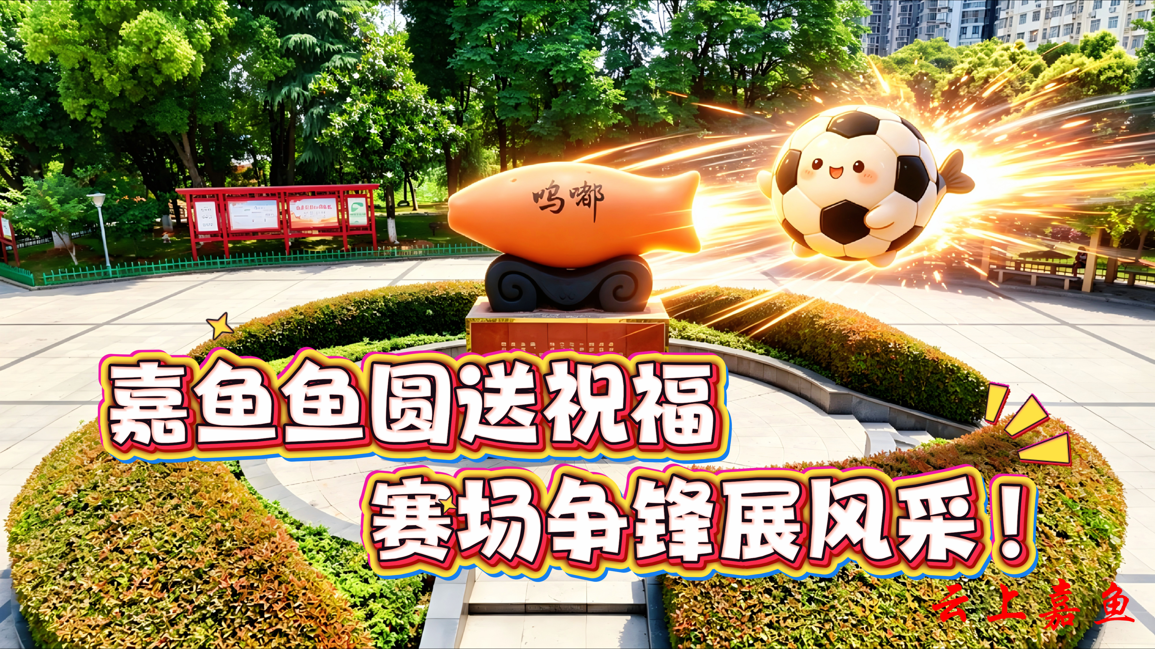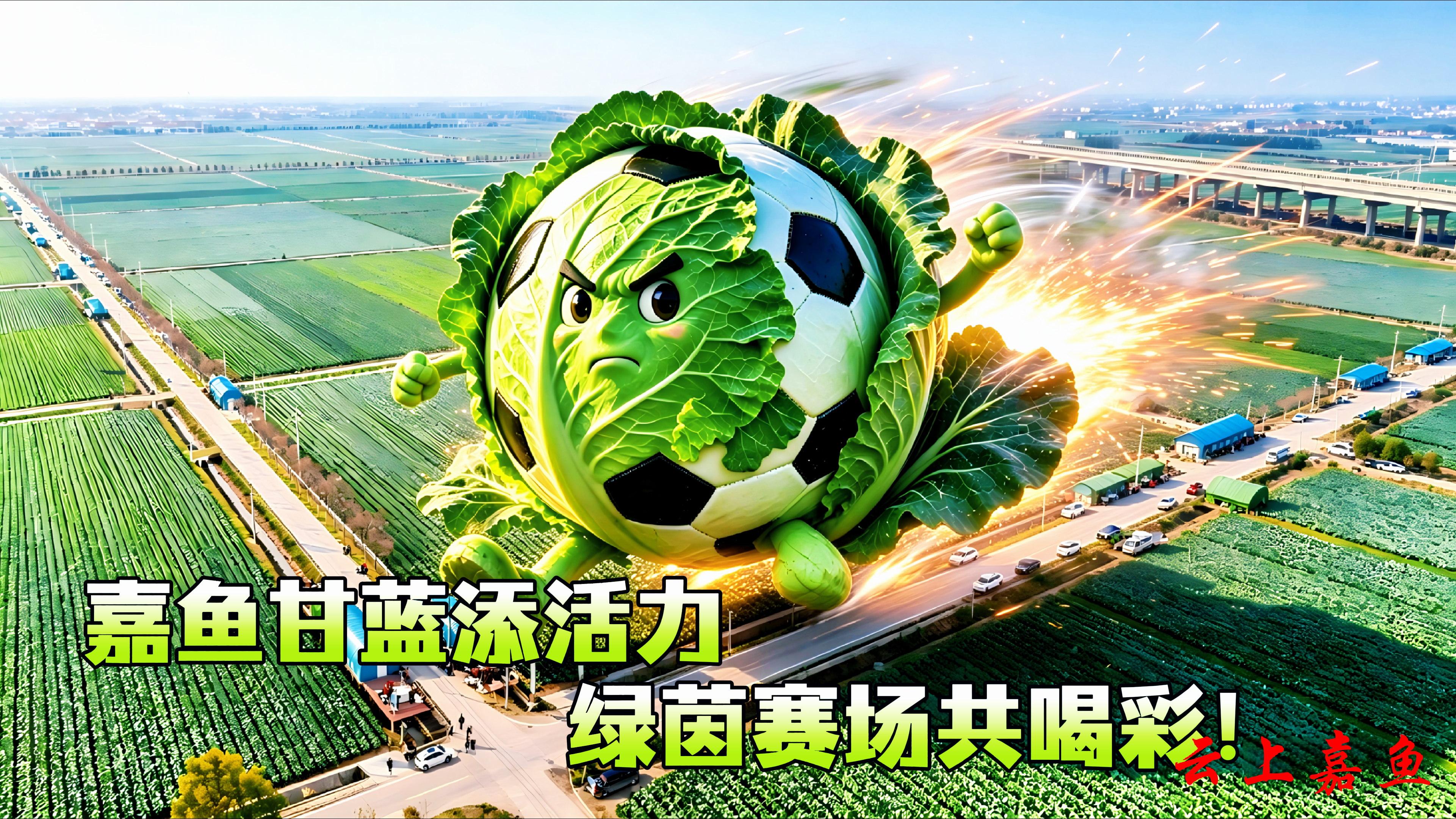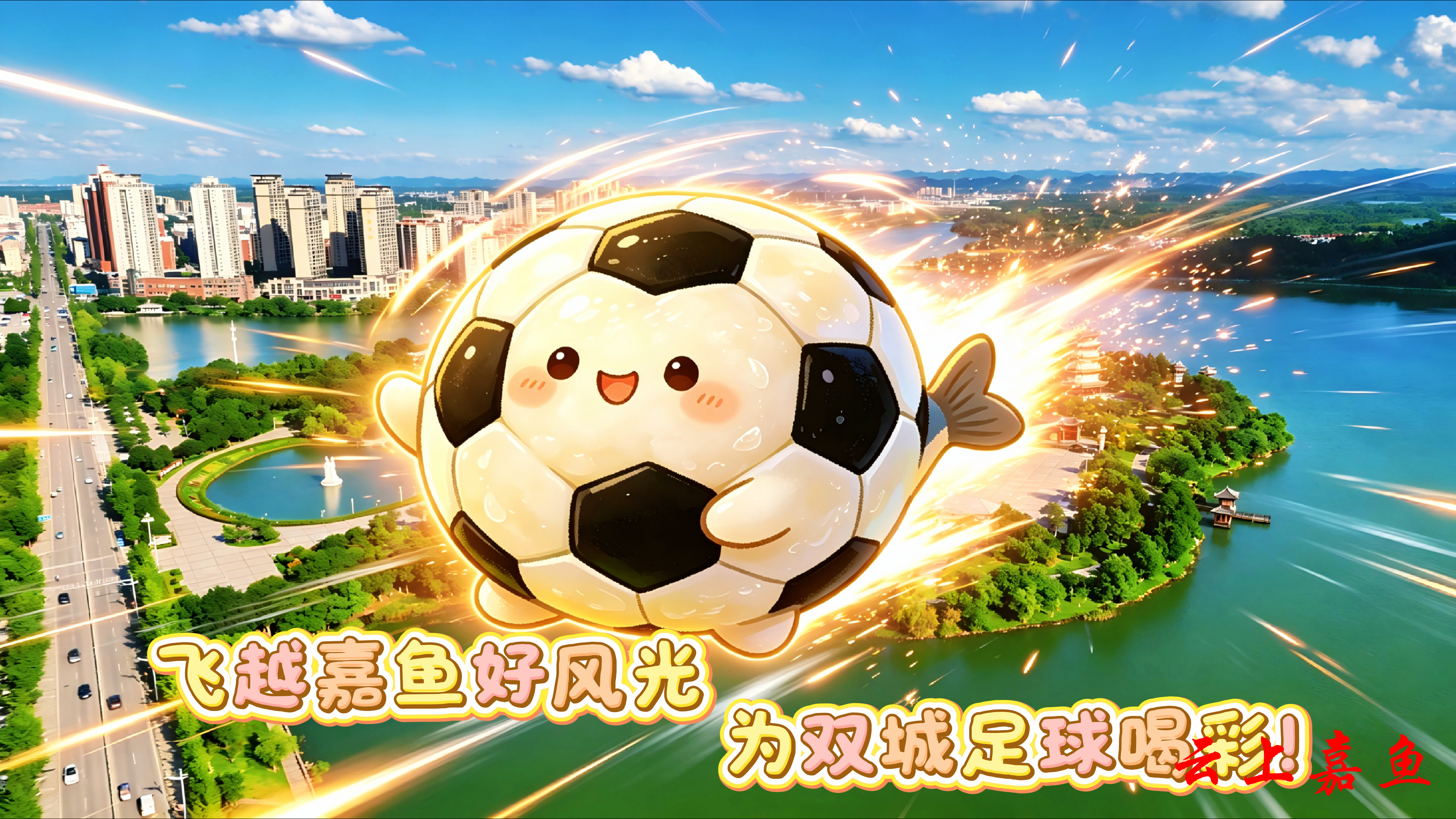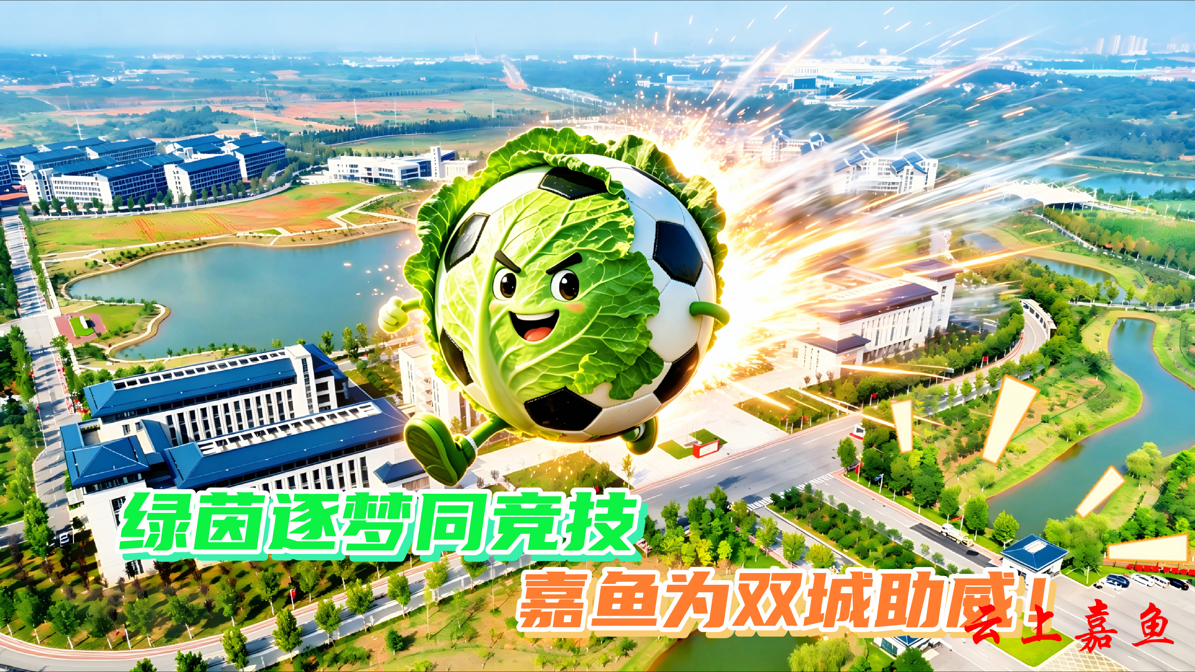 以AI创意打造的嘉鱼甘蓝、嘉鱼鱼圆等嘉鱼特色元素,飞越三湖连江、二乔故里、岳公楼等嘉鱼标志性景点,将嘉鱼田园活力与水乡灵气带到赛场,为咸宁、随州两支球队加油喝彩,让文旅魅力与体育精神同频共振。