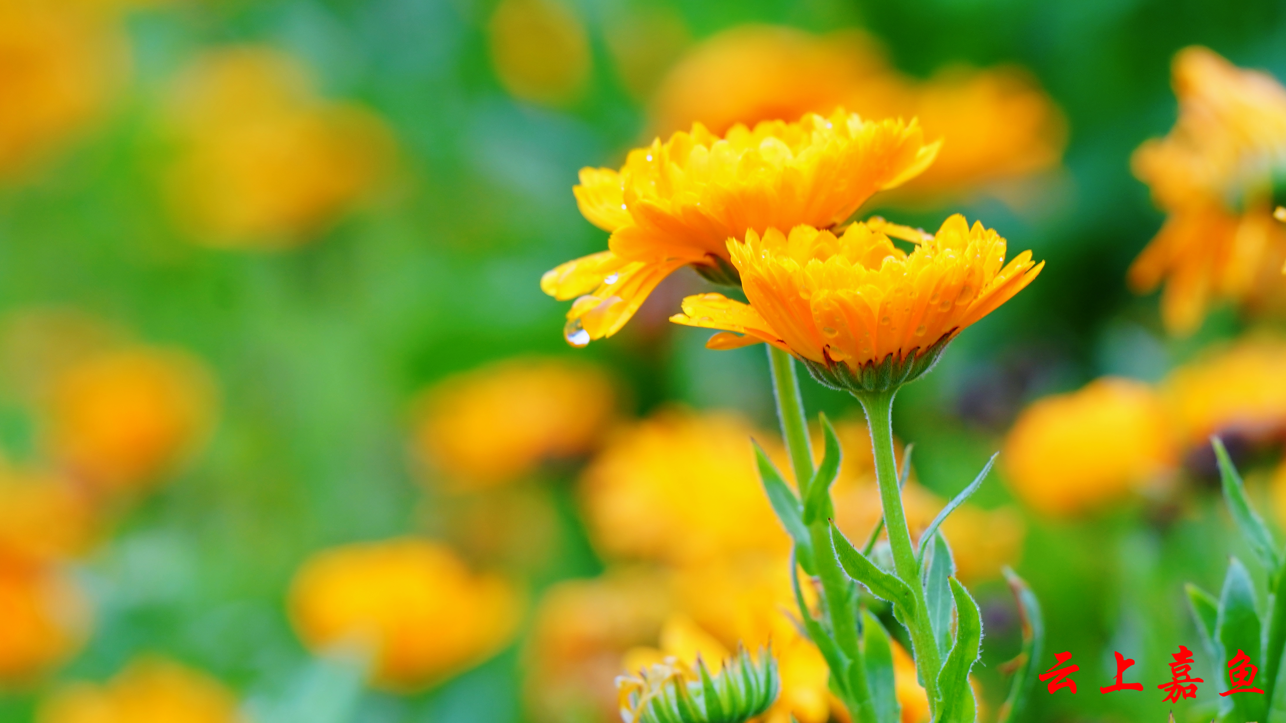 绵绵细雨浸润草木,碧叶凝露,繁花竞放。步道旁的金盏花层层舒展,饱满圆润的花盏向阳而生,暖橙花瓣温润鲜亮,明黄花蕊清新雅致,雨珠轻附瓣尖,在朦胧绿意里愈发娇俏动人。一路繁花绵延江岸,金盏漫染主坝步道一路铺展,绘就三湖连江畔独有的春日生态画卷。