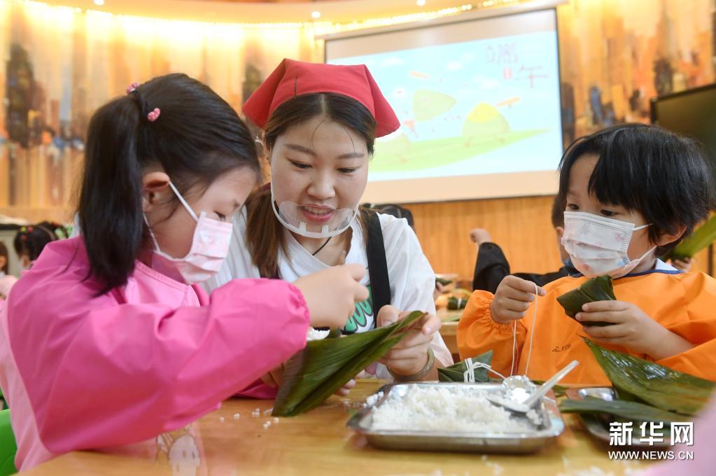 6月10日,在河北省张家口市万全区第一幼儿园,小朋友在体验包粽子。当日,河北省张家口市万全区第一幼儿园开展“品民俗 迎端午”主题活动,孩子们通过参加旱地龙舟、包粽子等活动,感受端午节的文化内涵,体验传统民俗文化。新华社发(武殿森 摄)