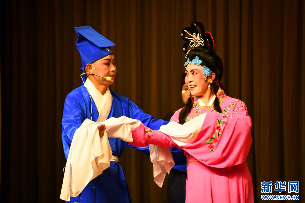 2021年5月26日,在河北省石家庄市高邑县南岩中心小学,演员为学生们展示戏曲动作。新华社发(许建园 摄)