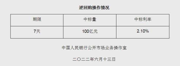 中新财经6月13日电 据央行网站6月13日消息,为维护银行体系流动性合理充裕,2022年6月13日人民银行以利率招标方式开展了100亿元逆回购操作,期限为7天,中标利率2.10%。(完) 图自央行网站 来源:中国新闻网
