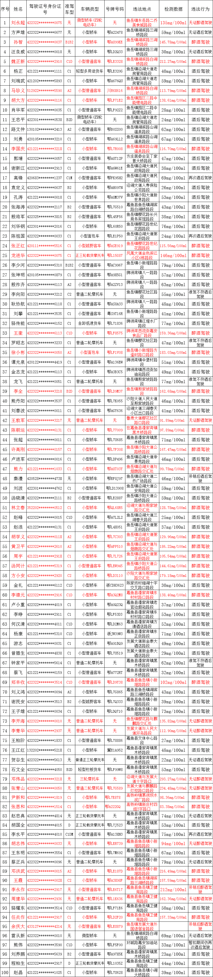 嘉鱼县公安局交警大队酒醉驾曝光台来了,下列人员因酒醉驾违法犯罪行为,被公安机关依法暂扣驾驶证6个月和吊销驾驶证,5年内不能重新申领等处罚。望广大居民对下列人员进行监督,一旦发现下列违法人员有驾驶机动车行为的请立即向公安机关举报。对举报违法行为经公安机关查实的,给予举报人奖励500元。举报电话:0715-6351271。