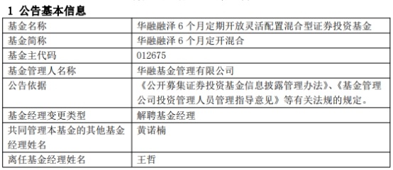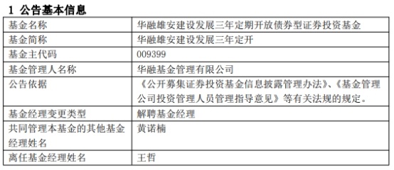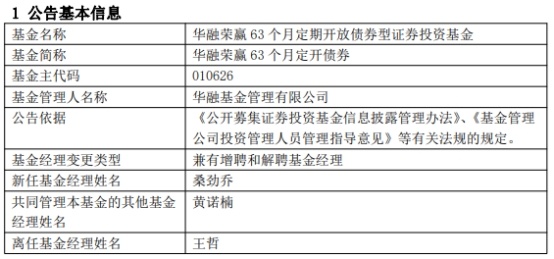王哲离任后,华融荣赢63个月定开债券增聘基金经理桑劲乔,与黄诺楠共同管理;华融雄安建设发展三年定开、华融融泽6个月定开混合由黄诺楠独立管理。