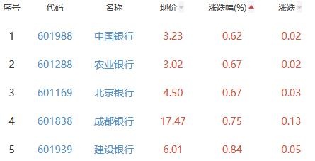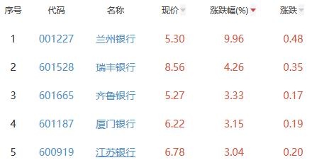 中国经济网北京6月14日讯 今日,银行板块整体涨幅2.01%,其中42只股票上涨,0只股票平盘,0只股票下跌。 数据显示,截至今日,银行板块近一周涨幅0.35%,近一月涨幅3.41%,近一季涨幅-2.03%。 其中,兰州银行、瑞丰银行、齐鲁银行、厦门银行、江苏银行位列板块涨幅前五位,涨幅分别为9.96%、4.26%、3.33%、3.15%、3.04%。 中国银行、农业银行、北京银行、成都银行、建设银行位列涨幅榜后五位,涨幅分别为0.62%、0.67%、0.67%、0.75%、0.84%。