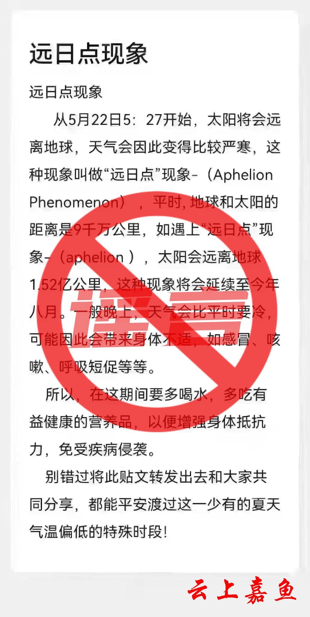 近日,网络上流传这样一则消息:从今年5月22日起太阳会远离地球,到达“远日点”,这个时期天气会因此变得比较寒冷,并会持续至今年八月。