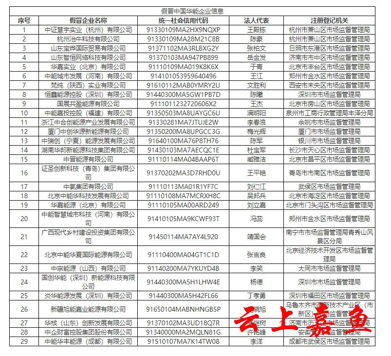 中国华能称,发现不法分子通过伪造中国华能集团有限公司(以下简称“中国华能”)所属企业证照和印章,在北京、深圳、杭州、郑州、西安等地工商系统中将29家企业的股东分别登记为华能(大连)能源热力有限责任公司、华能综合产业有限公司、华能海外企业管理有限公司、华能新能源股份有限公司以及天津华能杨柳青热电实业有限公司。