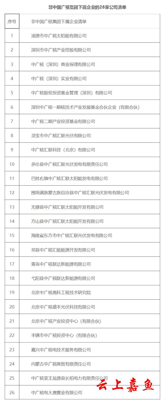 4月份,中广核发布公告称:凌源市中广核太阳能有限公司、深圳市中广核产业控股有限公司、嘉兴中广核电技术服务有限公司等26家公司在企业名称中使用“中广核”字样。鉴于该26家公司并非我集团下属企业,郑重澄清并严正声明,中国广核集团未拥有下述26家公司的任何资产或股权,亦无隶属或管理关系,并未授权下述公司使用“中广核”商标和字号,若因下述公司的经营行为导致法律、劳务纠纷或其他相关责任,均与我集团无关。