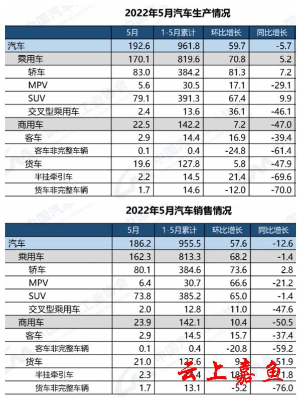 中汽协发布的5月汽车市场产销数据显示,5月汽车产销呈现恢复性增长,环比大幅上升。汽车产销分别完成192.6万辆和186.2万辆,环比分别增长59.7%和57.6%,同比分别下降5.7%和12.6%。