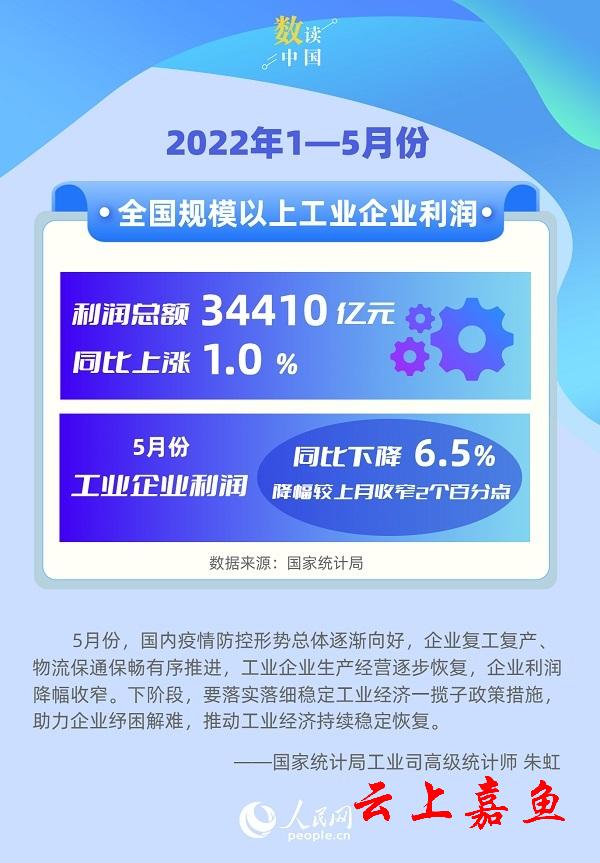 人民网北京6月27日电 (记者杨曦)国家统计局今日发布数据显示,1—5月份,全国规模以上工业企业实现利润总额34410.0亿元,同比增长1.0%。5月份,全国规模以上工业企业利润同比下降6.5%,降幅较上月收窄2.0个百分点。