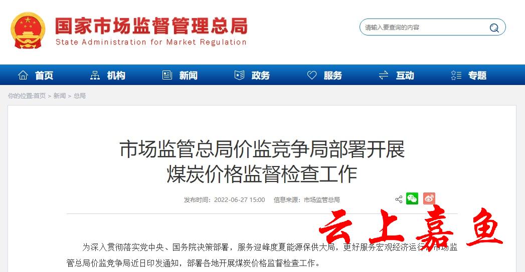 人民网北京6月27日电 (记者杨曦)据市场监管总局消息,为深入贯彻落实党中央、国务院决策部署,服务迎峰度夏能源保供大局,更好服务宏观经济运行,市场监管总局价监竞争局近日印发通知,部署各地开展煤炭价格监督检查工作。