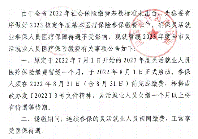 关于暂缓2023年度全市灵活就业职工基本医疗保险缴费的公告