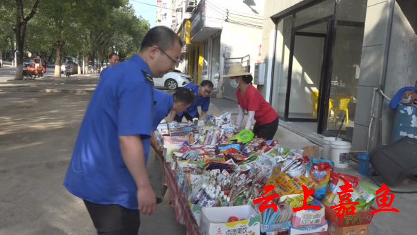 在北门湖片区鱼岳三小路段,执法队员对出店经营的商户进行耐心规劝,动之以情,晓之以理,向商户们讲解占道经营、影响市容市貌的危害,并合力将商户沿街摆放的物品搬移到店内。