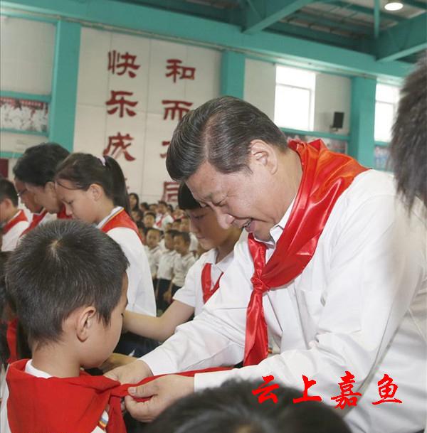 2014年5月30日,在北京市海淀区民族小学的少先队入队仪式上,习近平为新少先队员系上红领巾。