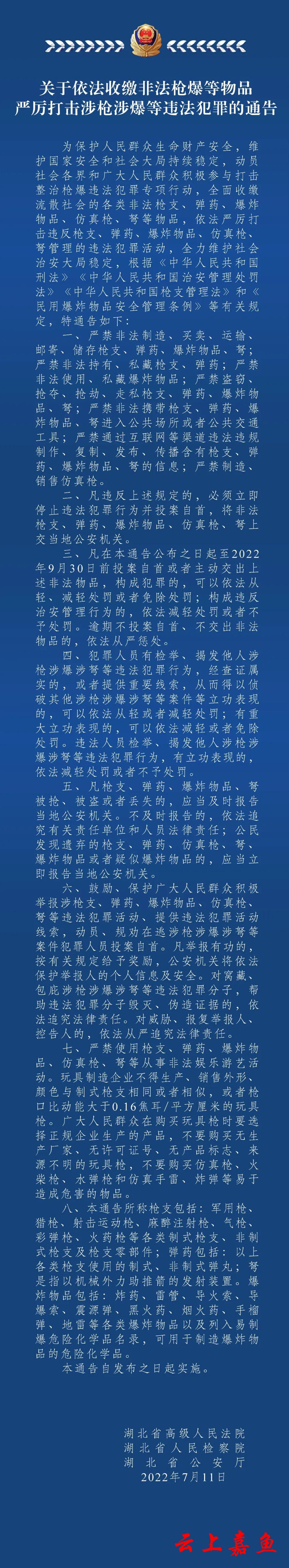 三、凡在本通告公布之日起至2022年9月30日前投案自首或者主动交出上述非法物品,构成犯罪的,可以依法从轻、减轻处罚或者免除处罚;构成违反治安管理行为的,依法减轻处罚或者不予处罚。逾期不投案自首、不交出非法物品的,依法从严惩处。